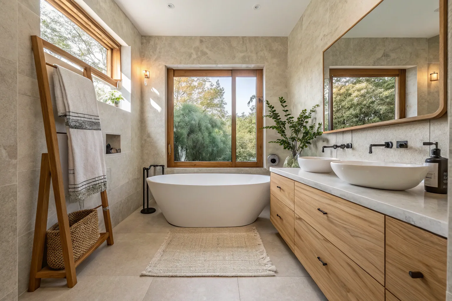- Large Decorative Mirror with Wooden Frame: Give your bathroom a natural touch and open space with a large wooden-framed mirror.