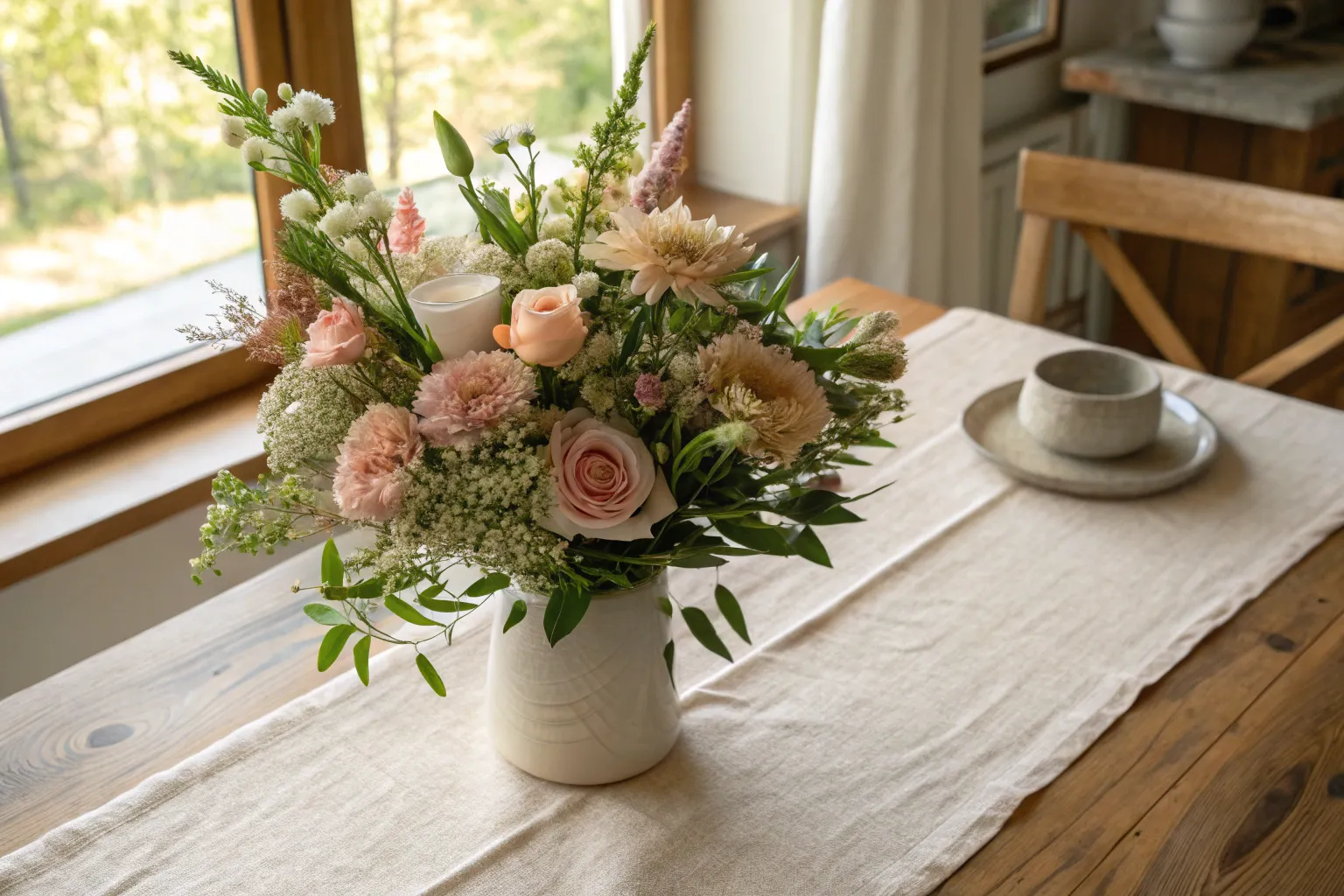 Bring the outdoors in with a garden-inspired bouquet. Use wildflowers and lush greens to create a natural, free-spirited look.