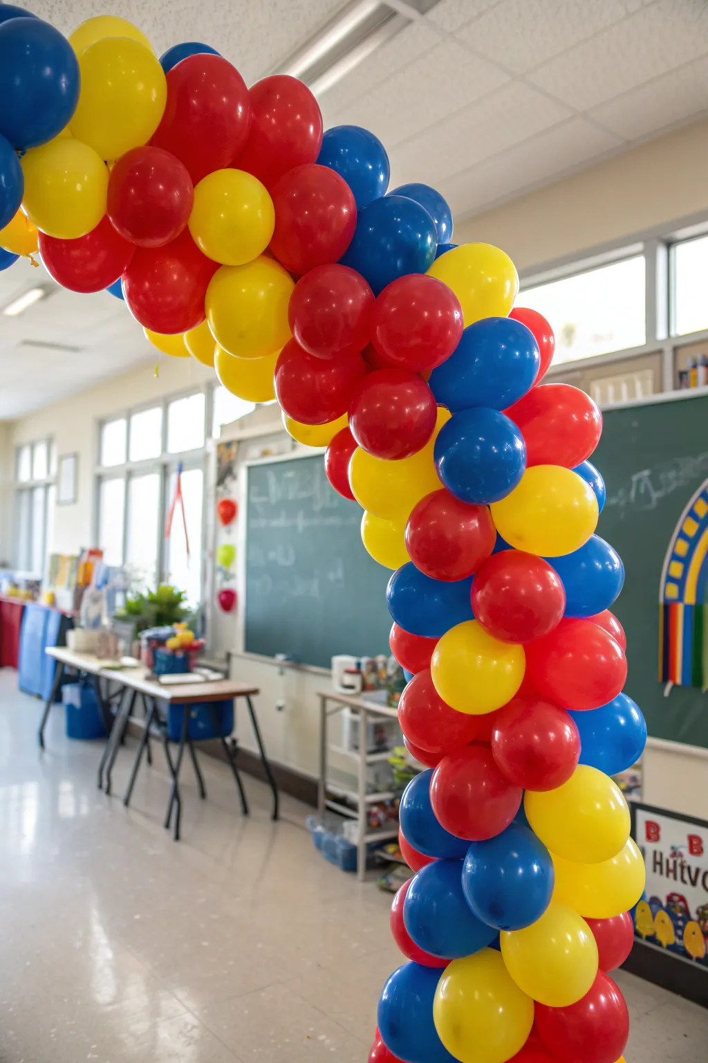Stick to the basics with a balloon garland in primary colors. I used this for a school event, and it brought a burst of energy to the room. 🌈 #ColorfulDecor #SchoolVibes