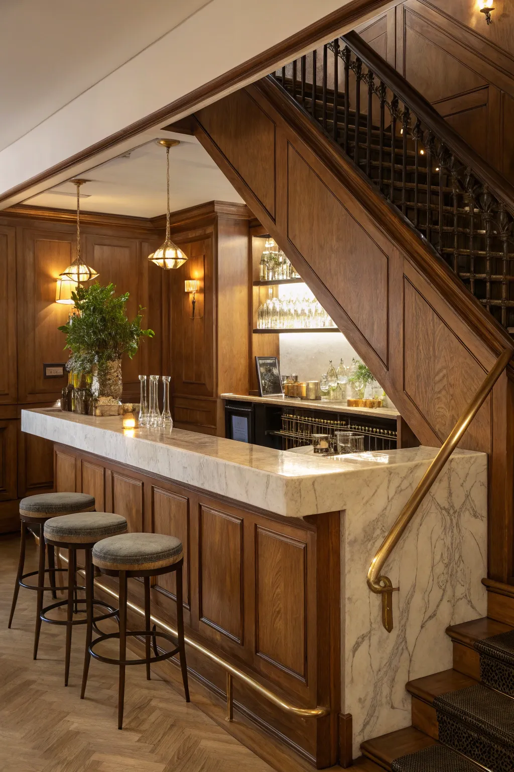 - Wood Under-Stair Shelving: Maximize storage with warm wood shelving, perfect for bottles and glasses.