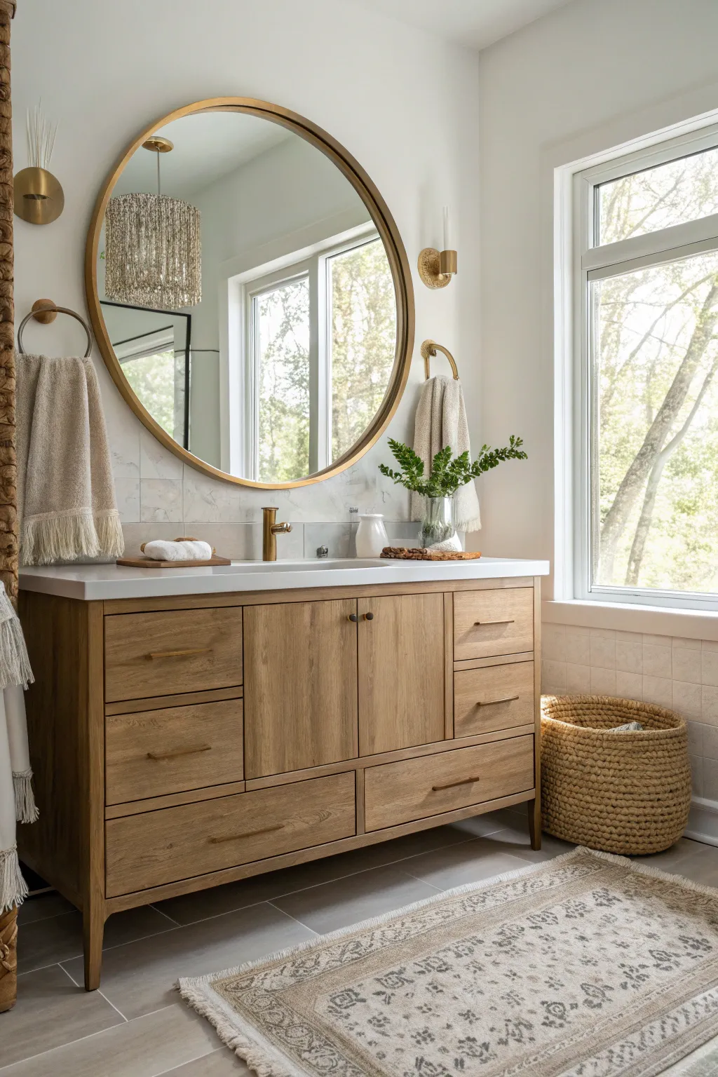 Infuse a bohemian flair into your bathroom with a round mirror framed with woven materials. This style pairs beautifully with textured textiles and earthy tones.