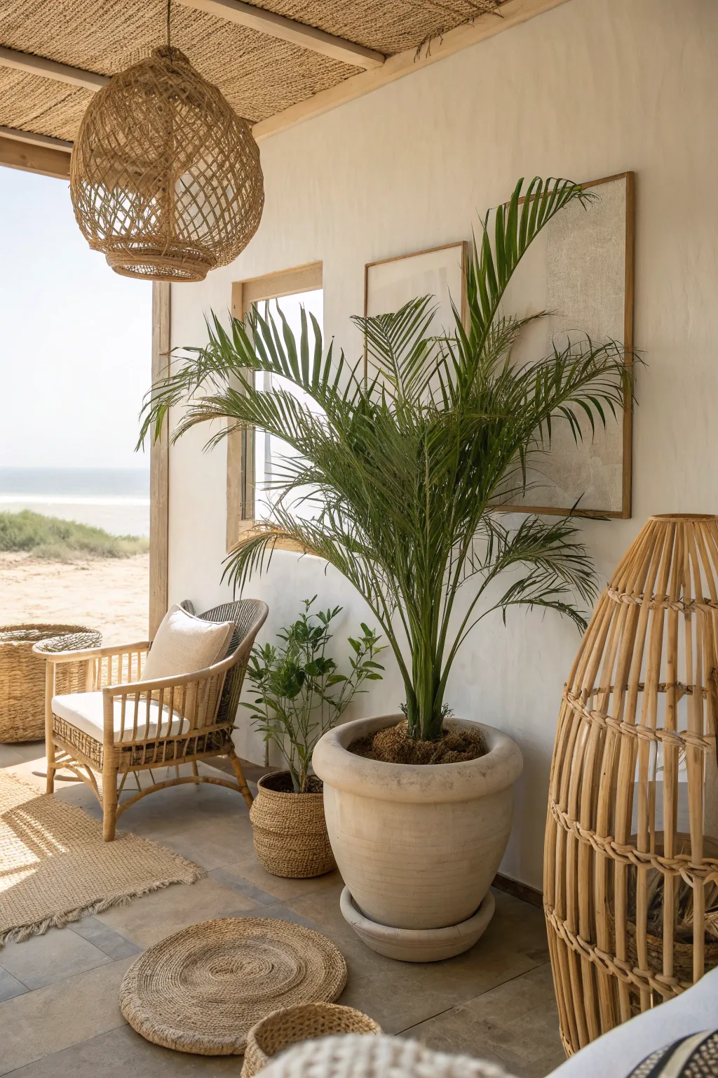 Plants like palms and succulents offer a tropical touch that enhances the beach ambiance. They bring life into the room and remind me of lush coastal landscapes.