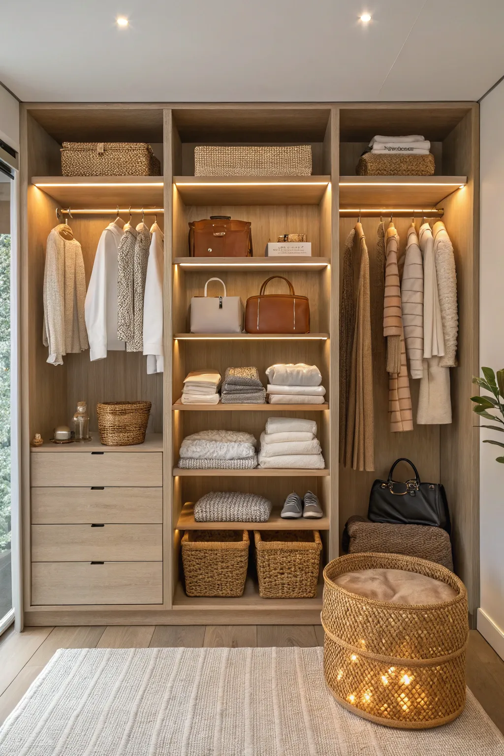 - Woven Storage Baskets: Enhance closet storage with eco-friendly woven baskets for a natural and organized look.