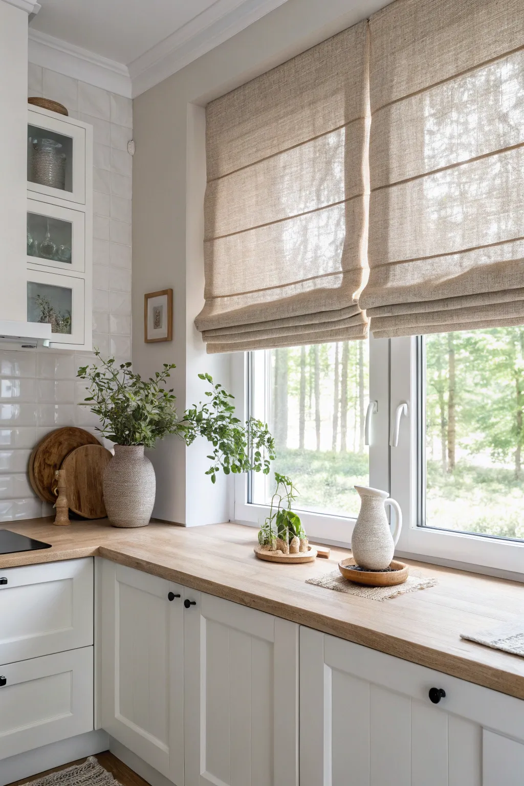 - Linen Roman Shades: Transform your kitchen with elegant linen Roman shades, adding a warm, stylish touch.