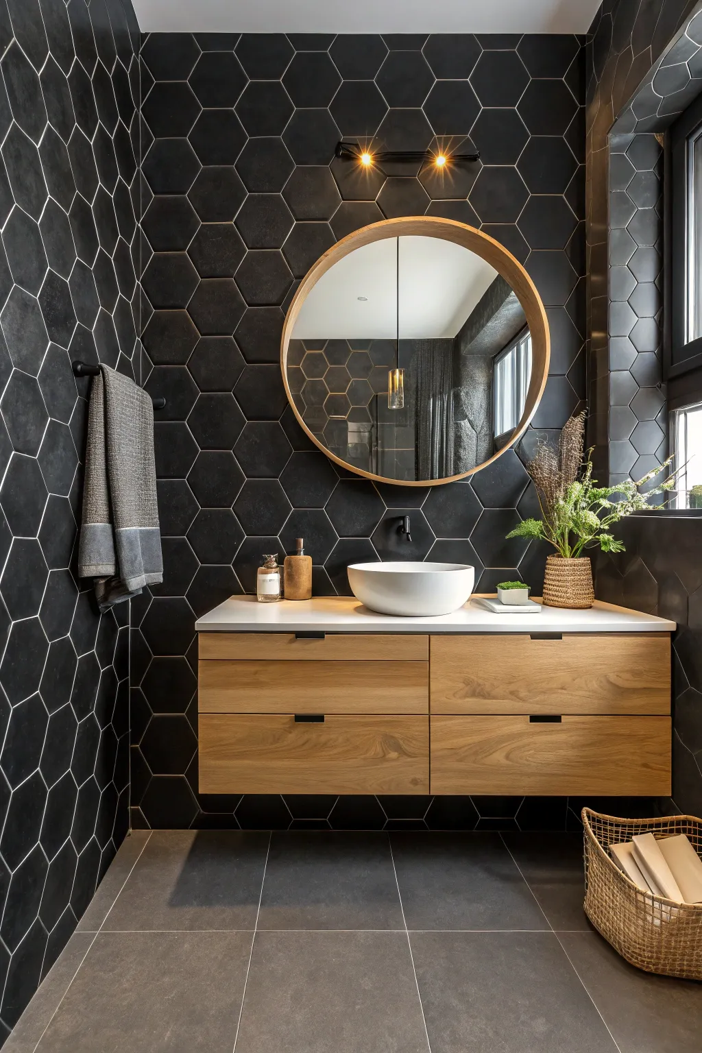 Incorporate wood accents like vanities or shelves to soften the boldness of black hexagon tiles. This fusion of natural warmth and modern geometry is simply irresistible.
