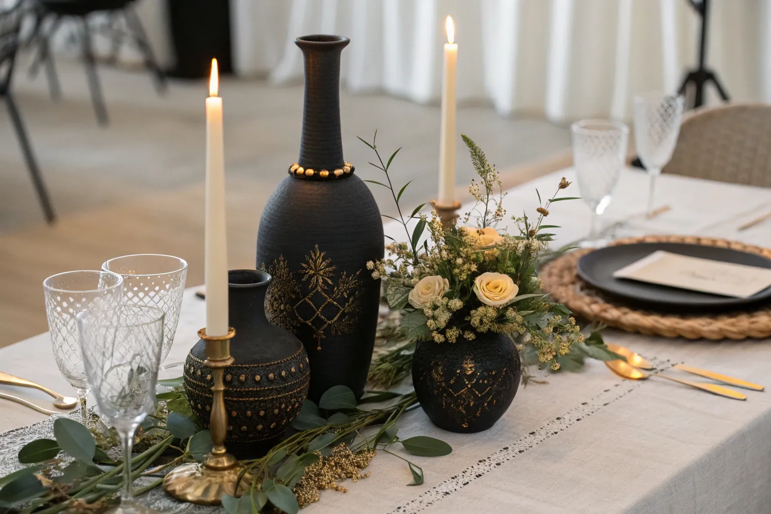 Opt for black vases filled with white or cream flowers to create a stunning contrast. I’ve always loved how this simple choice can elevate the entire table setting.