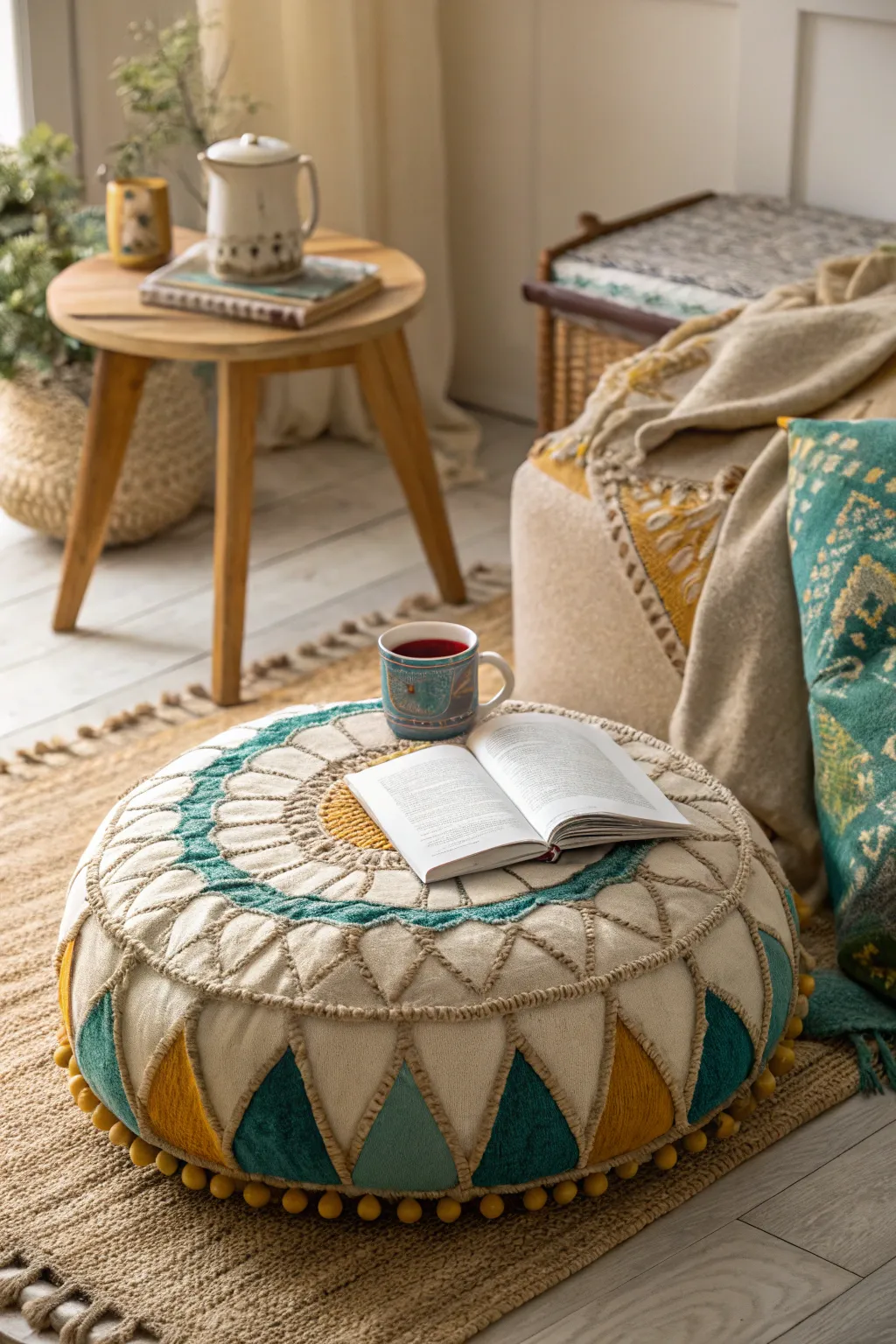 - Bohemian Floor Cushion: Enhance comfort with a colorful floor cushion, perfect for lounging in style and relaxation.