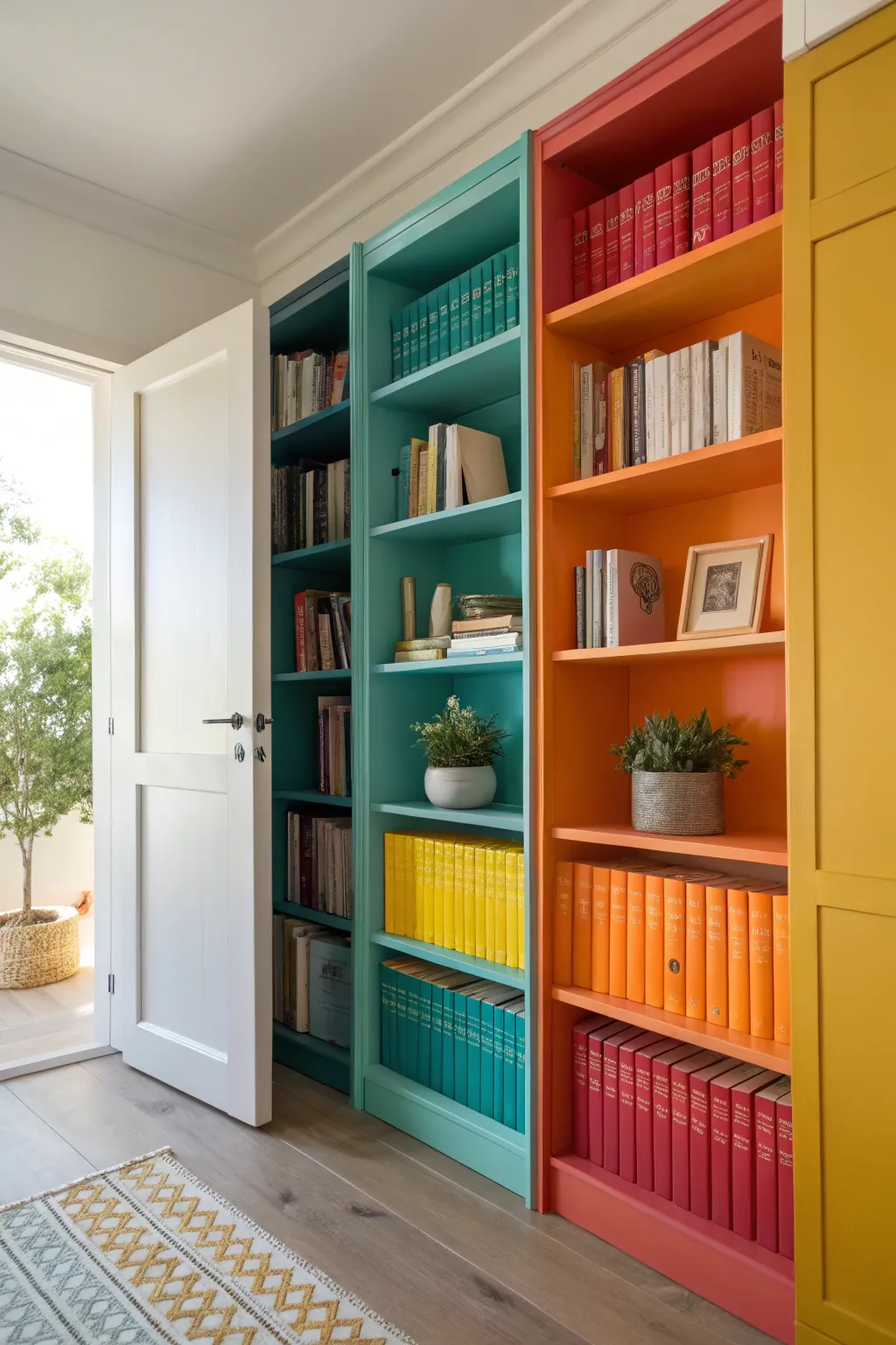 Arrange books by color for a visually striking display. This color-coded bookshelf not only looks appealing but also adds a vibrant touch to your closet.