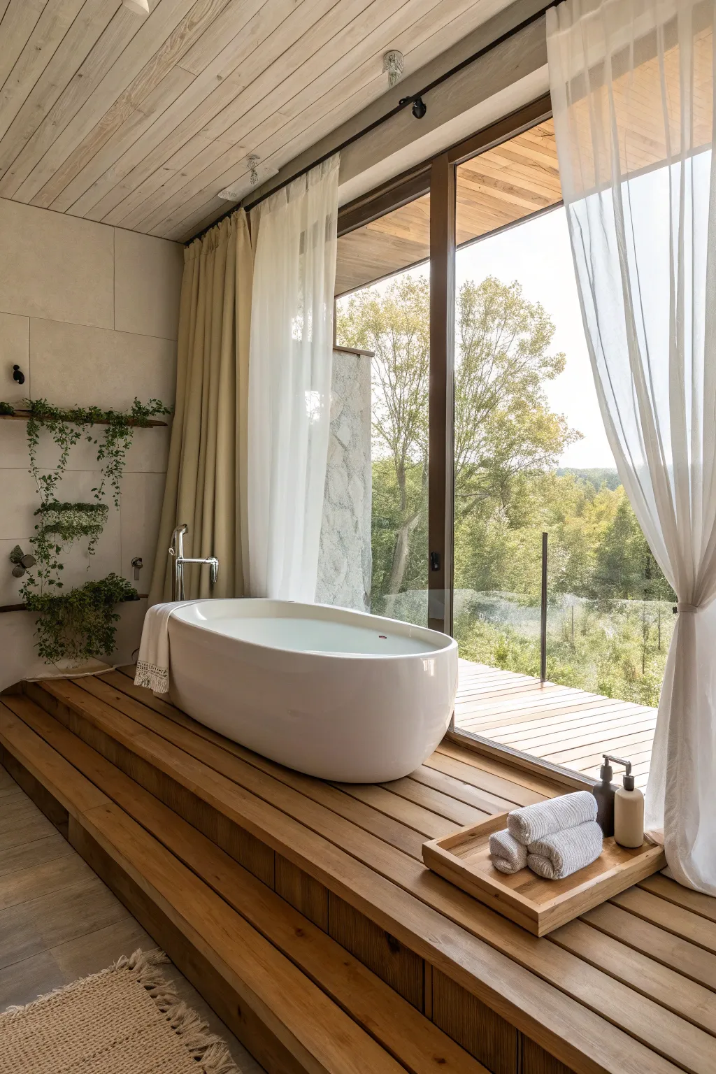 Incorporate wooden accents around your built-in tub to add warmth and a touch of nature. I’ve always loved how wood can soften a space and bring a cozy, inviting feel to the bathroom.