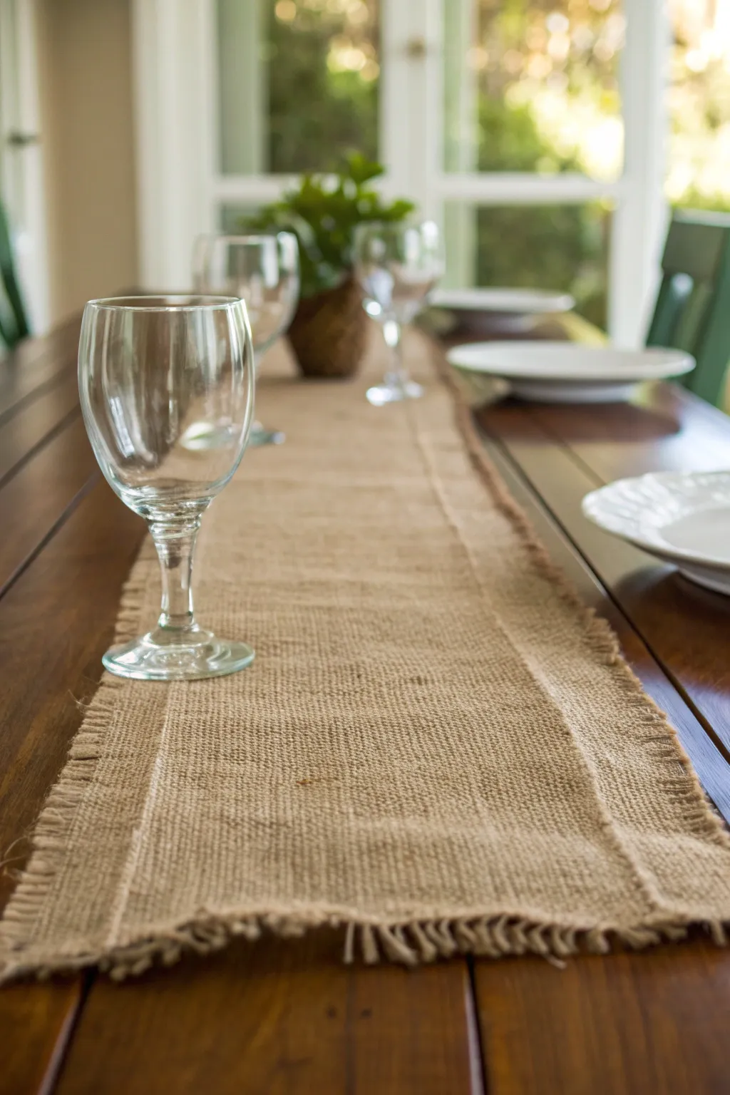 Add a playful twist by opting for a burlap runner with fringed edges. It’s an easy DIY project that brings a casual, bohemian vibe to your table.