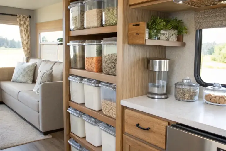 Living in an RV means every inch of space counts, especially in the pantry. With some strategic thinking, you can turn even the tiniest pantry into a model of efficiency and elegance. Hang Overhead Baskets Elevate your storage game with overhead baskets that add space without clutter. Overhead baskets can provide additional storage without taking up shelf space. They’re ideal for lighter items and keep your pantry looking airy and organized. Check if these fit…