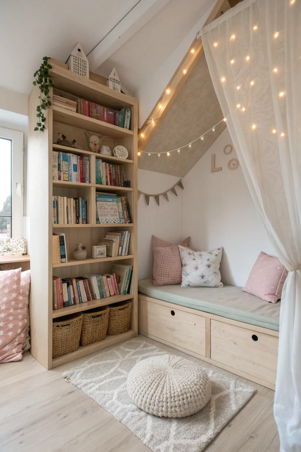 Cultivate a love for reading with a fairy tale reading nook. We transformed a corner with cushions and shelves, creating a storytelling paradise.