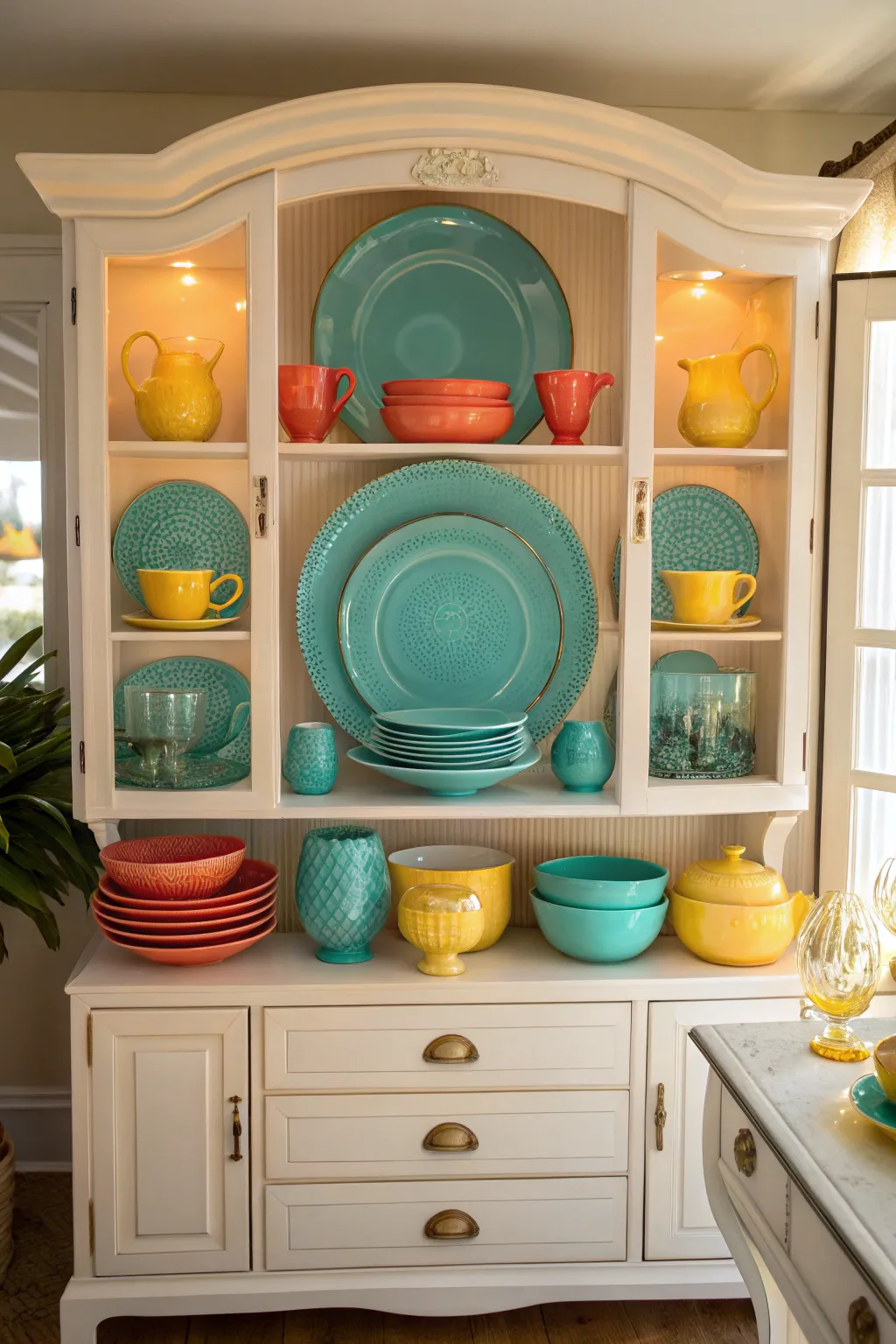 - Colorful Ceramic Dinnerware Set: Add vibrant symmetry with colorful dinnerware, enhancing your china cabinet’s elegant balance.