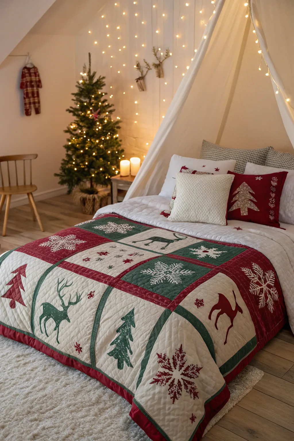 Plaid patterns in red, green, and white are a timeless choice that never fails to evoke the feeling of Christmas. I always find that these classic designs add a cozy charm to any bedroom.