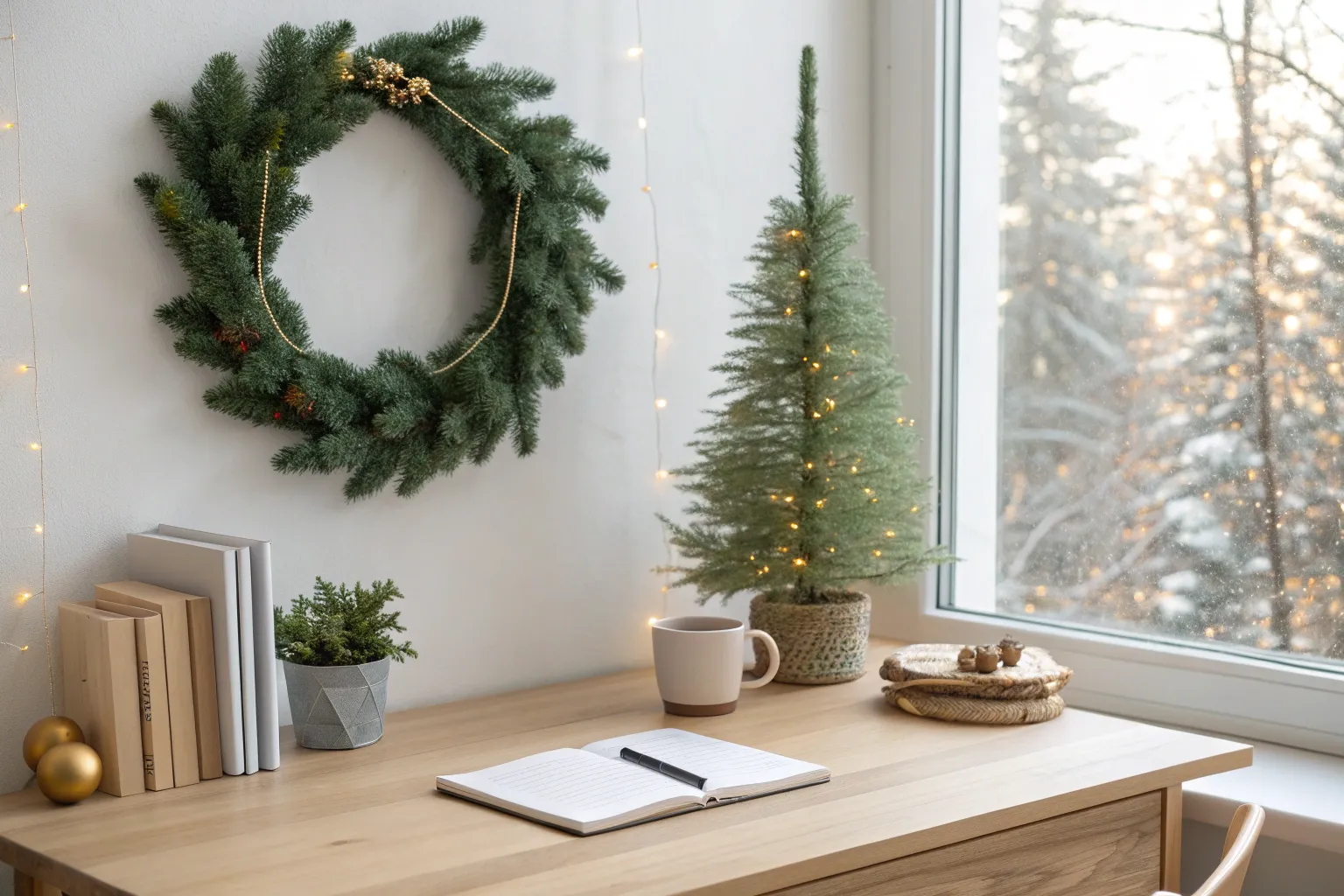 Decorate your workspace with mini wreaths and bows for a classic holiday vibe. I like to hang a small wreath above my desk for a traditional touch.
