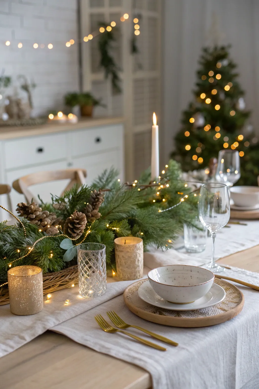 Bring the winter woods indoors with a lush pine garland that adds a rustic and aromatic charm to your table.