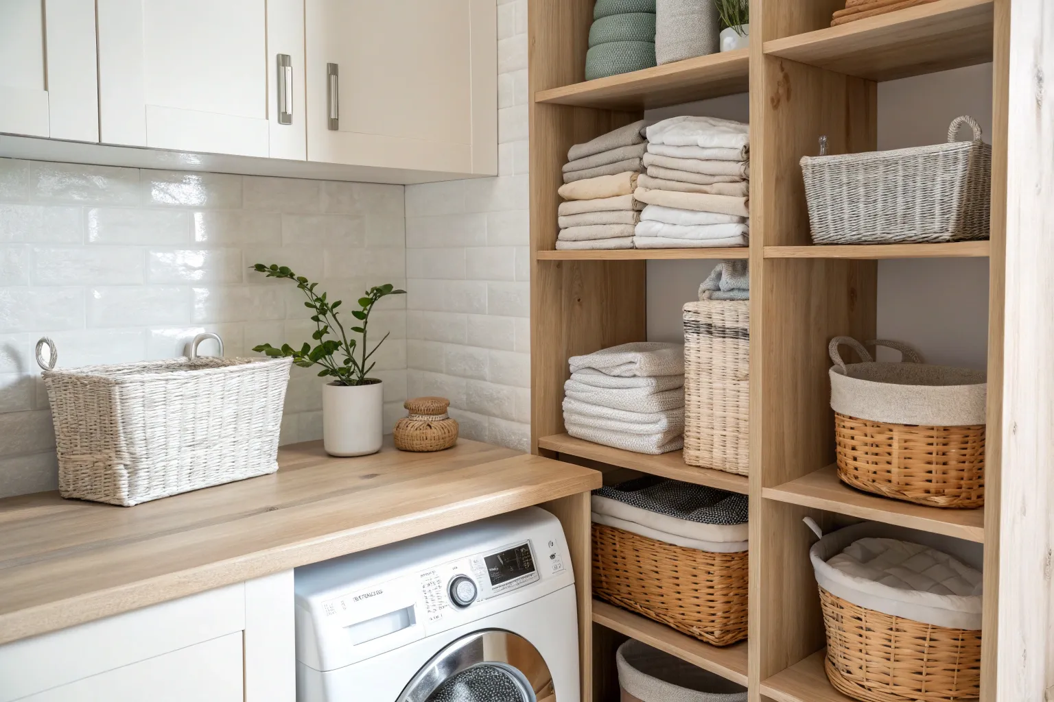 • Wicker Storage Baskets: Enhance your storage space with decorative wicker baskets. Ideal for organizing laundry supplies.