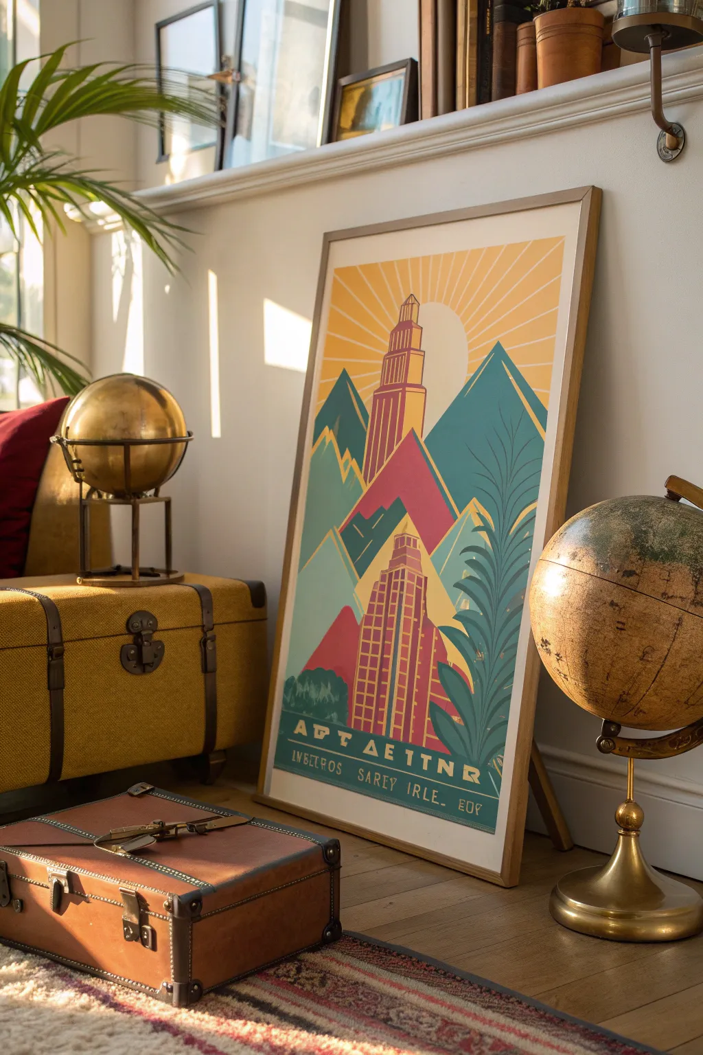 Add a pop of color with retro travel posters. These vibrant designs evoke the spirit of classic adventures.