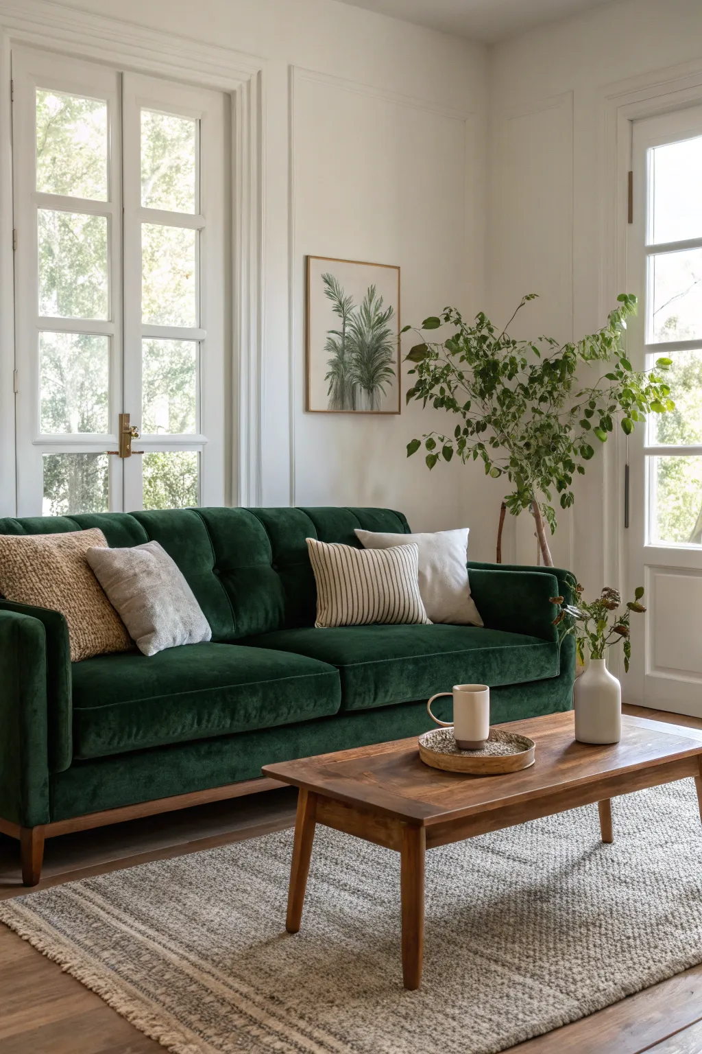 Complement your dark green couch with wooden furniture like coffee tables or side tables. Wood adds warmth and creates a balanced, earthy feel.