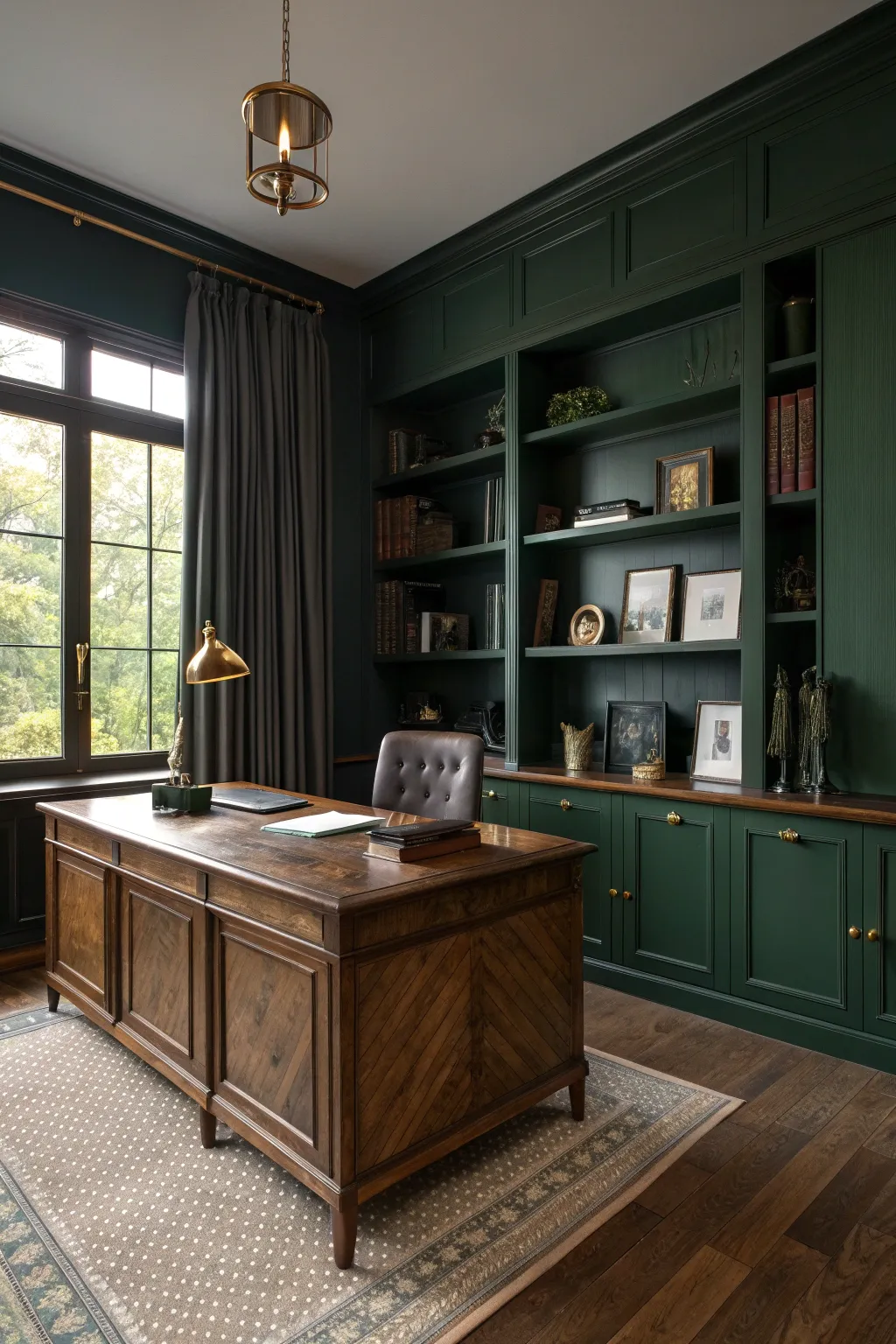 Add metal accents like gold or brass to complement dark green walls. These touches provide a modern edge and shine that can transform your office into a stylish retreat. #MetallicDecor #OfficeStyle #InteriorDesign