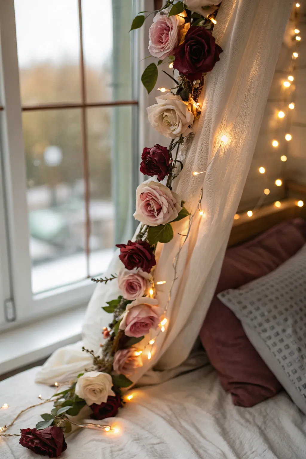 String a garland of dried roses with twinkle lights for a magical decor piece. It’s perfect for draping over a bed or window.