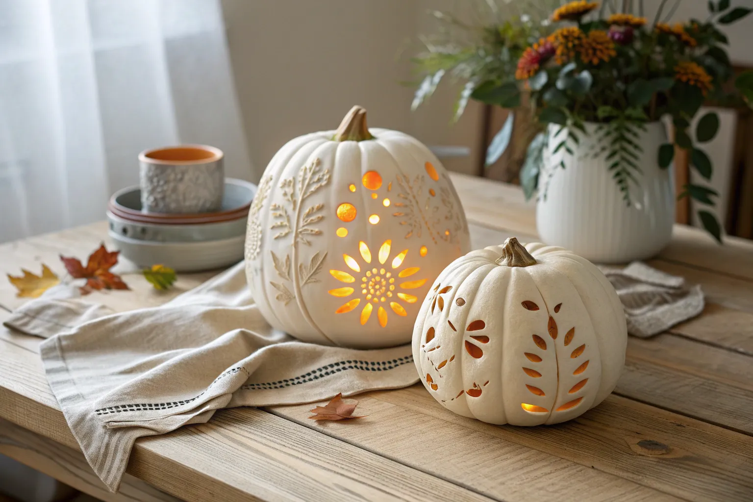 Highlight the beauty of fall by carving one pumpkin with intricate leaves and the other with a harvest theme. Celebrate the season with this decorative pair.