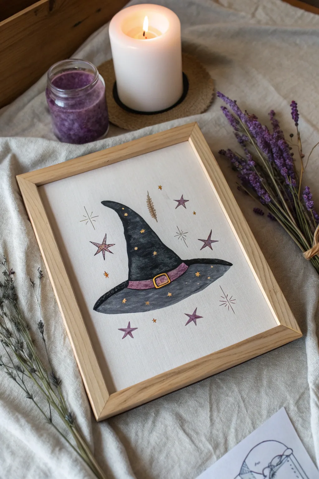 Design a canvas featuring a witch’s hat with stars and sparkles. I love how this adds a touch of magic to the hallway.