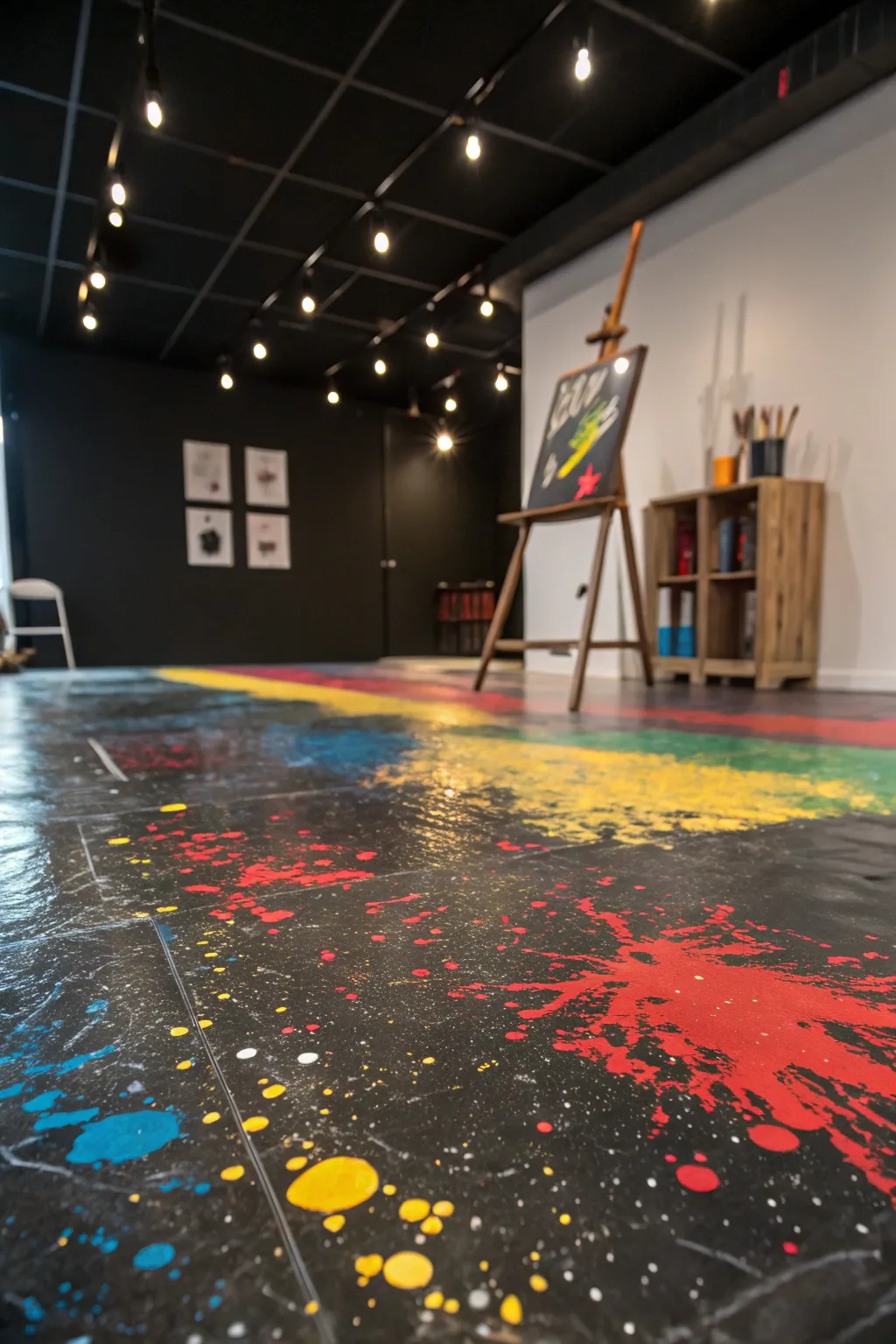 If you’re feeling bold, an artistic splatter design in epoxy can turn your floor into a canvas. This lively and creative option adds excitement to any room, especially art studios or creative spaces.