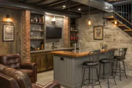 • Rustic Bar Stools: Enhance your snack bar with stylish seating, adding comfort and charm to your farmhouse basement.