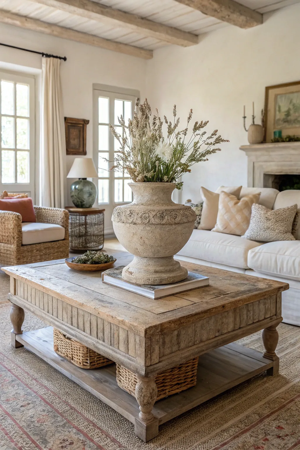 - Weathered Wood Coffee Table: Anchor your living room with a rustic wood coffee table, adding warmth and character.