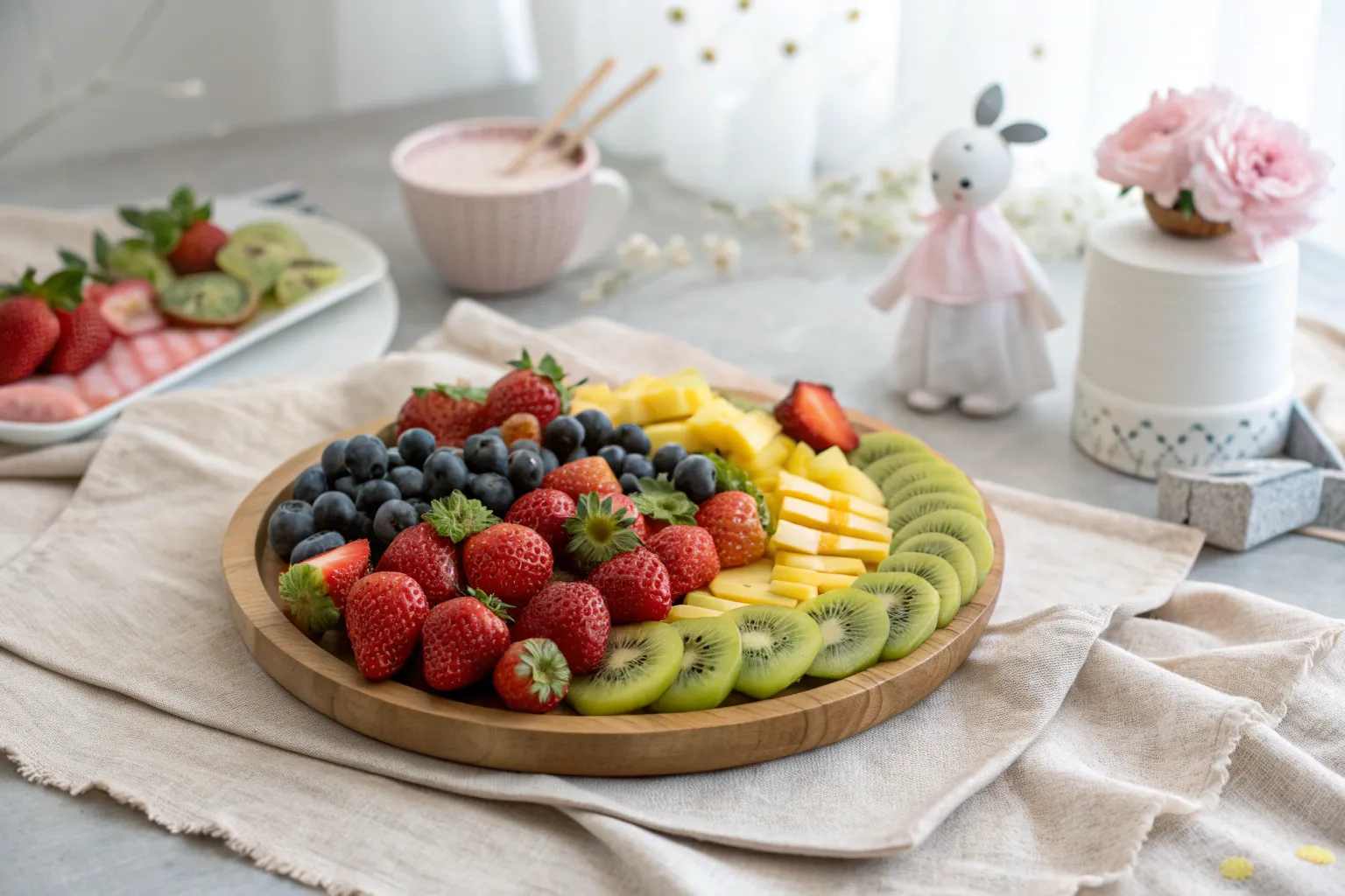 Arrange slices of kiwi, pineapple, and berries in a rainbow pattern for a burst of color. This simple yet striking design brings a touch of magic to your table.