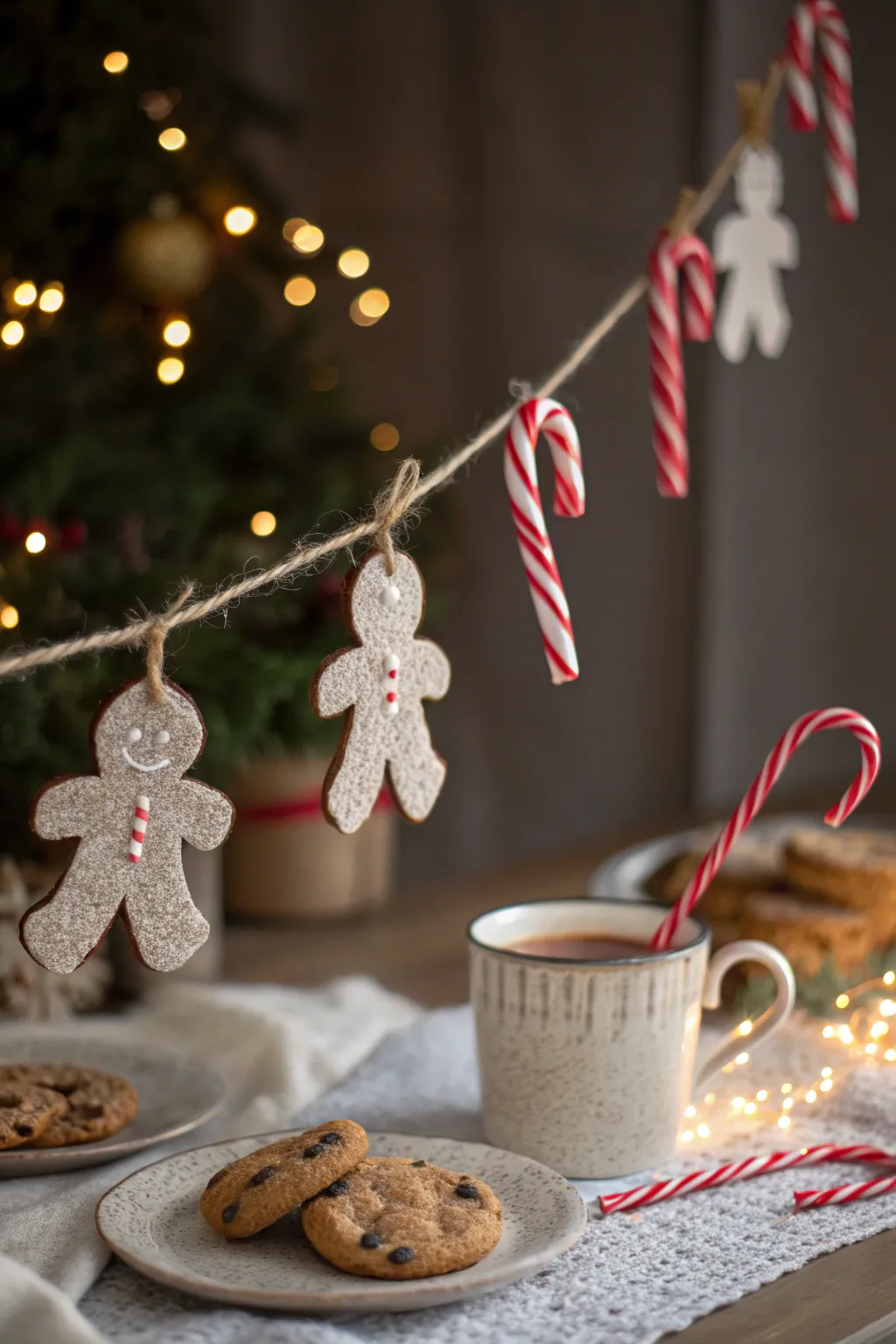 Craft a garland from paper cutouts of gingerbread men and candy canes to hang around the room. It’s a simple yet charming way to add a handmade touch to your party decor. 🎉 #DIYDecor #HolidayCrafts