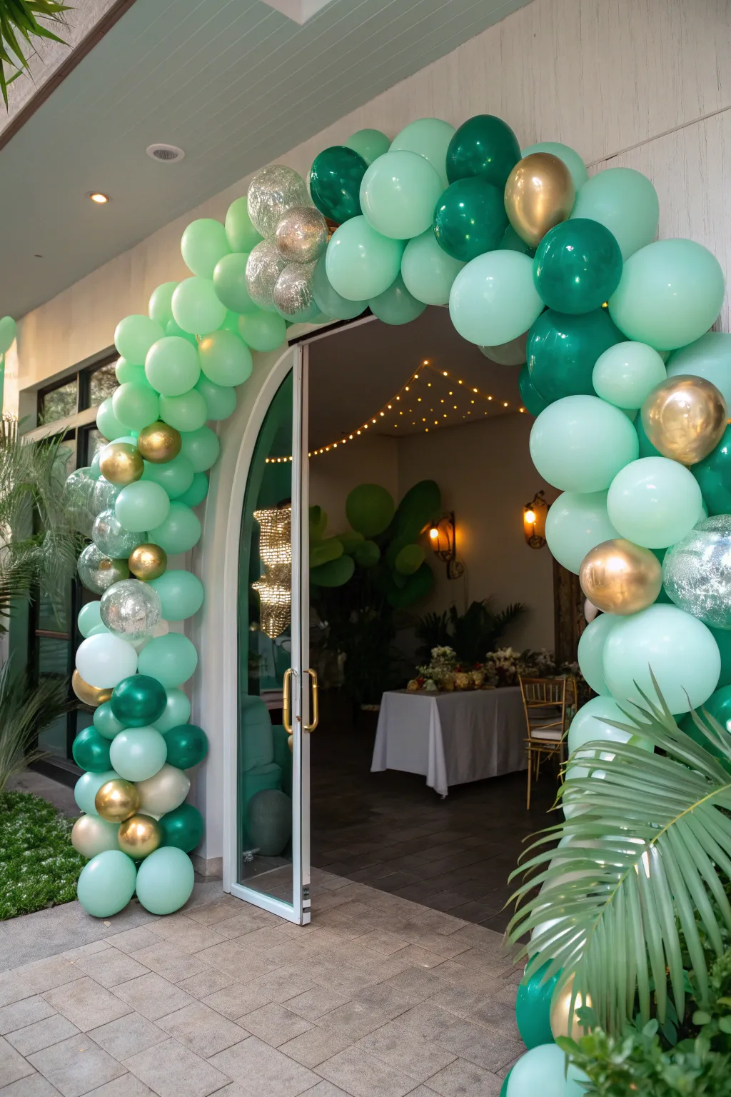 Create an inviting entrance with a balloon arch in varying shades of green, accented with gold or silver. I once crafted a stunning arch using a mix of jade and mint balloons, and it truly set the tone for the entire event.
