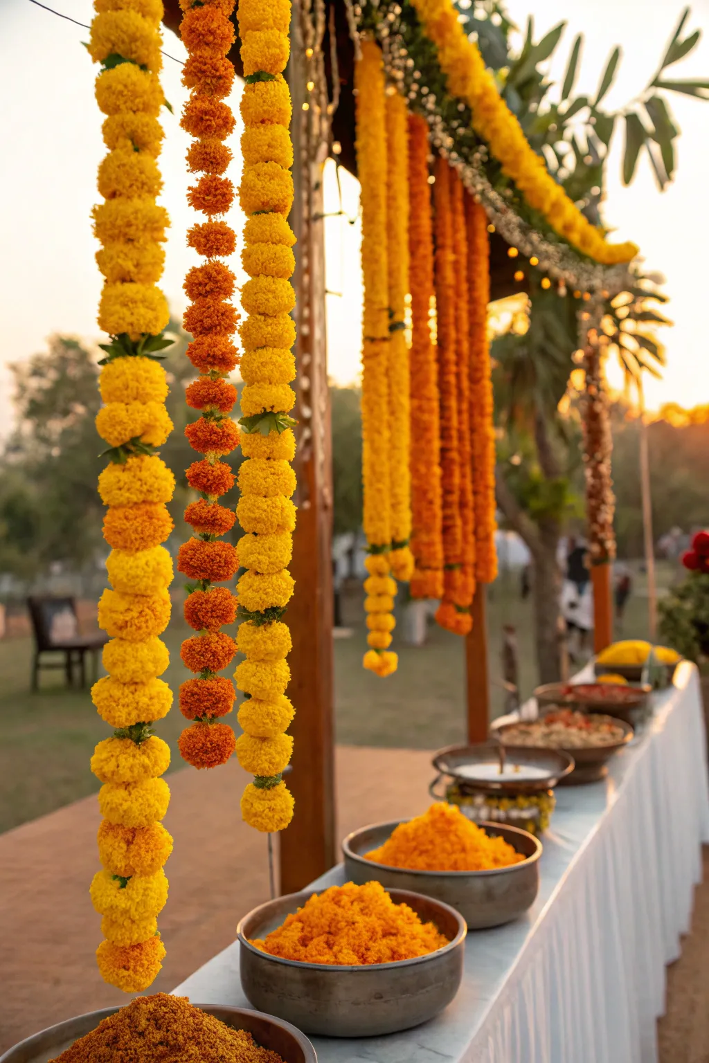 - Marigold Garland Decorations: Enhance your decor with vibrant marigold garlands to add a festive touch.