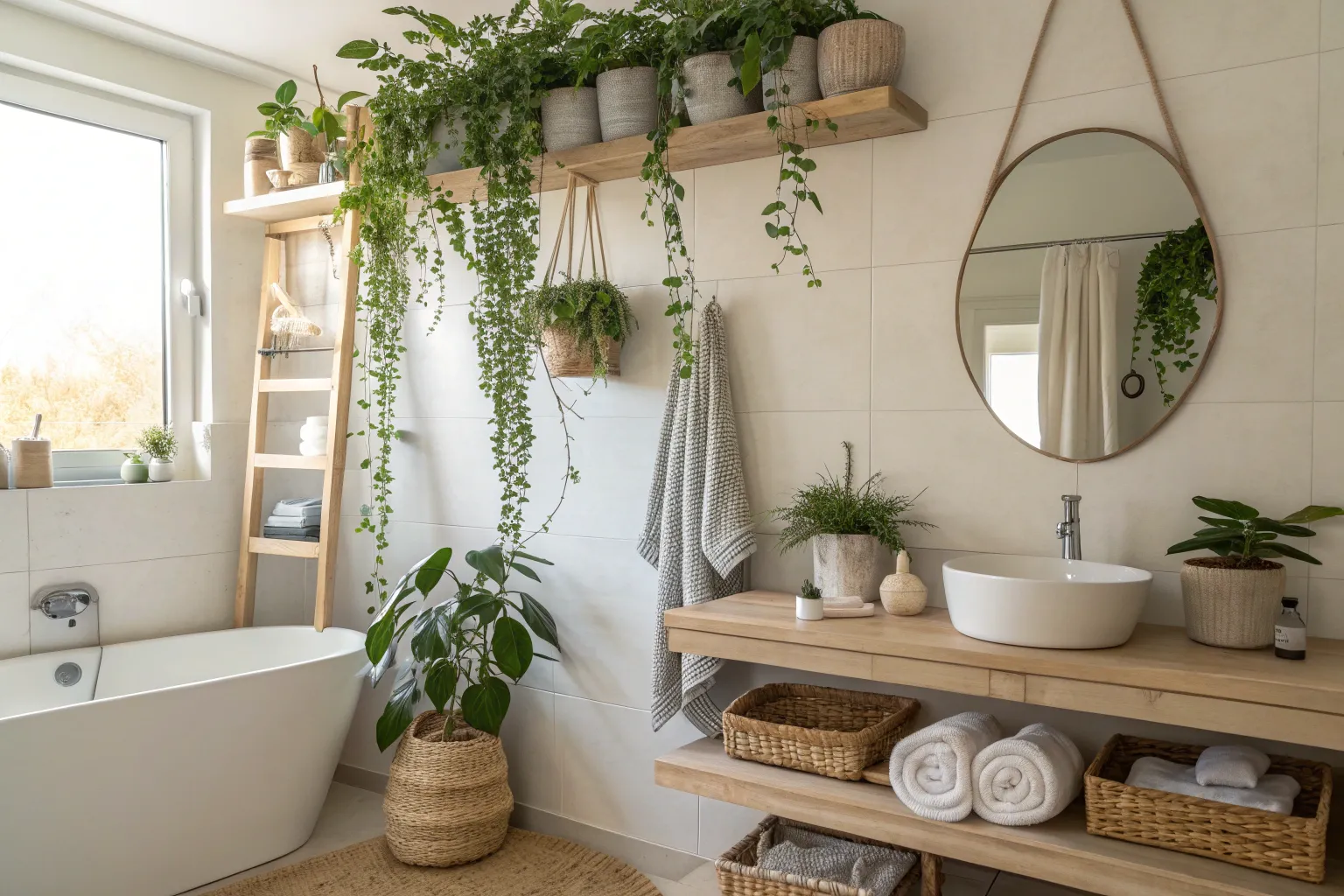 Add a bohemian flair with macramé hangers that cradle your plants beautifully. These are my go-to for adding texture and style to any bathroom.