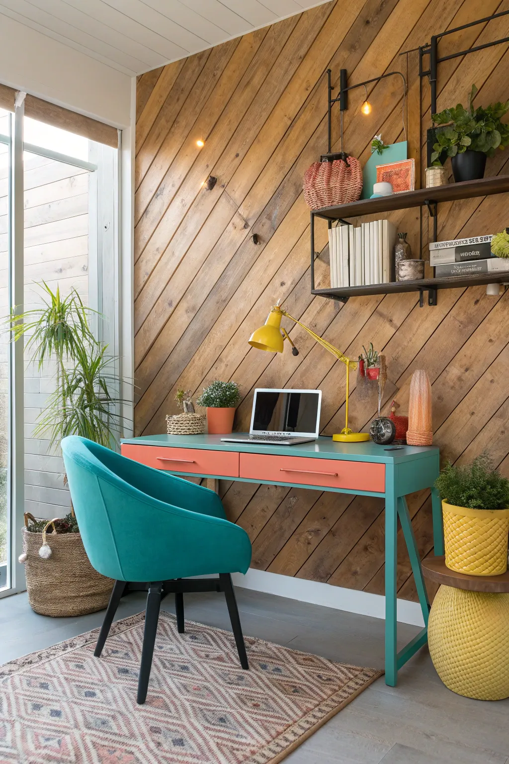Create a multi-colored hardwood wall for a vibrant and eclectic look. This approach adds character and is sure to spark conversation.