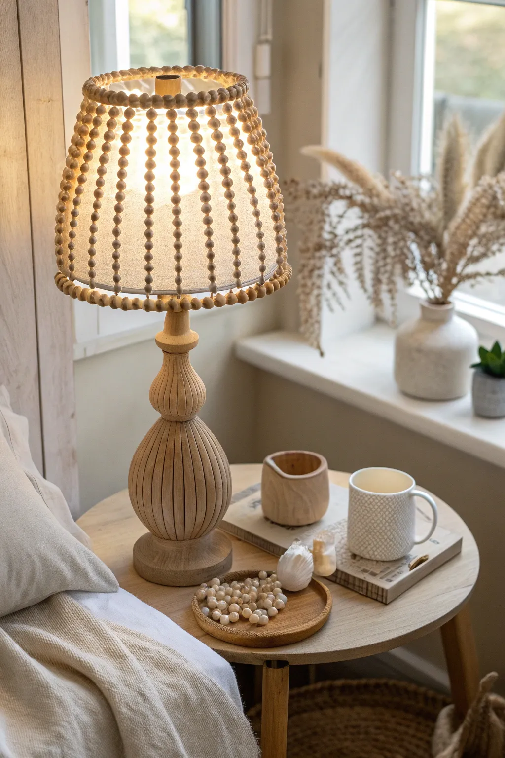 Add wooden beads to a lampshade for a soft, diffused light effect. It’s an elegant way to bring warmth and charm to your lighting.