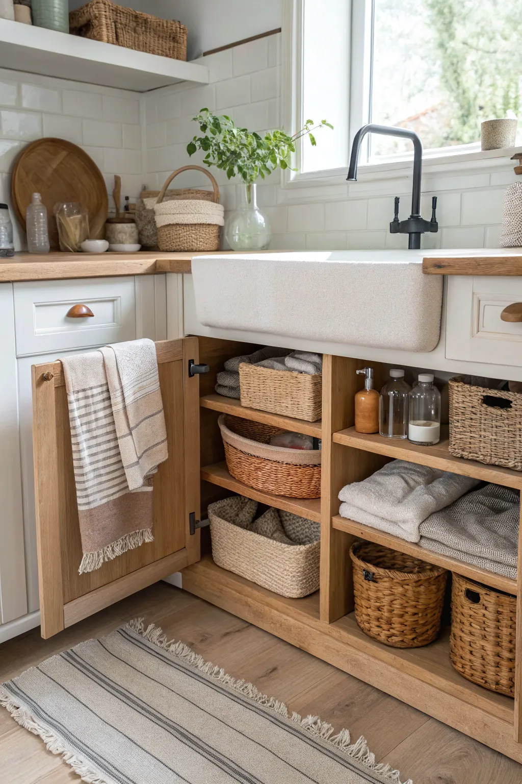• Wicker Storage Baskets: Organize under the sink with these stylish wicker baskets, perfect for holding cleaning supplies.