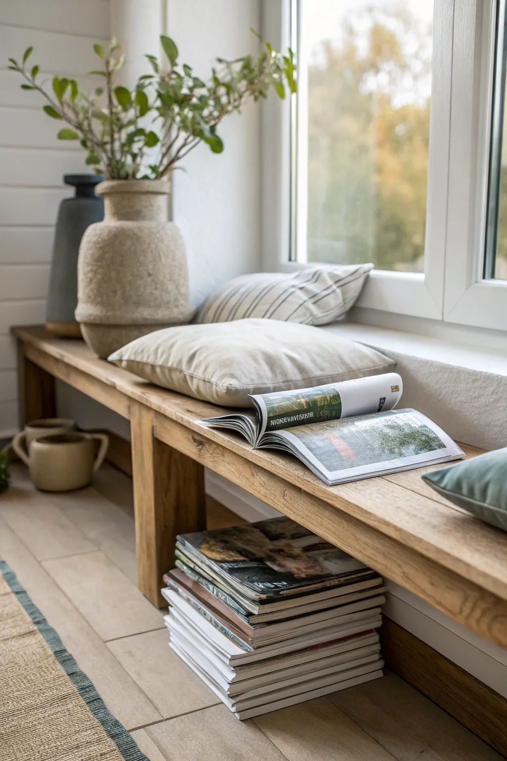 A neat stack of magazines on an entryway bench can be both inviting and practical. I find it a perfect spot to grab a quick read on the go.