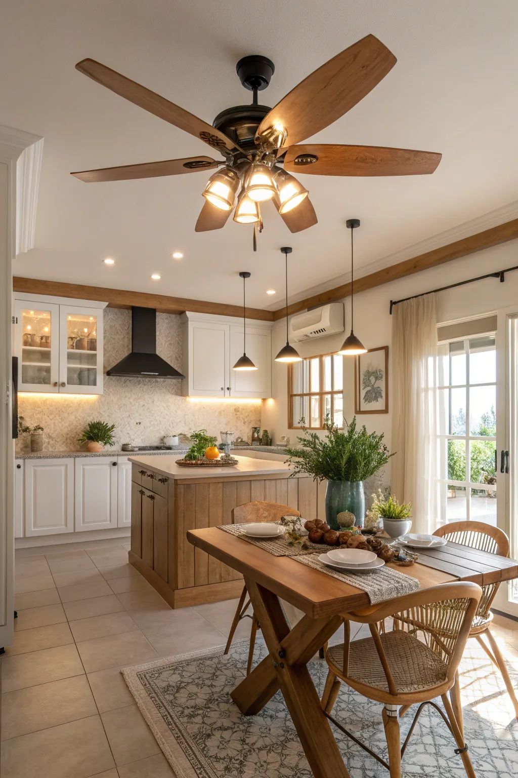 Combine the functionality of a fan with the elegance of a chandelier for a stunning focal point. This dual-purpose design is perfect for those who love a touch of glamour in their kitchen.