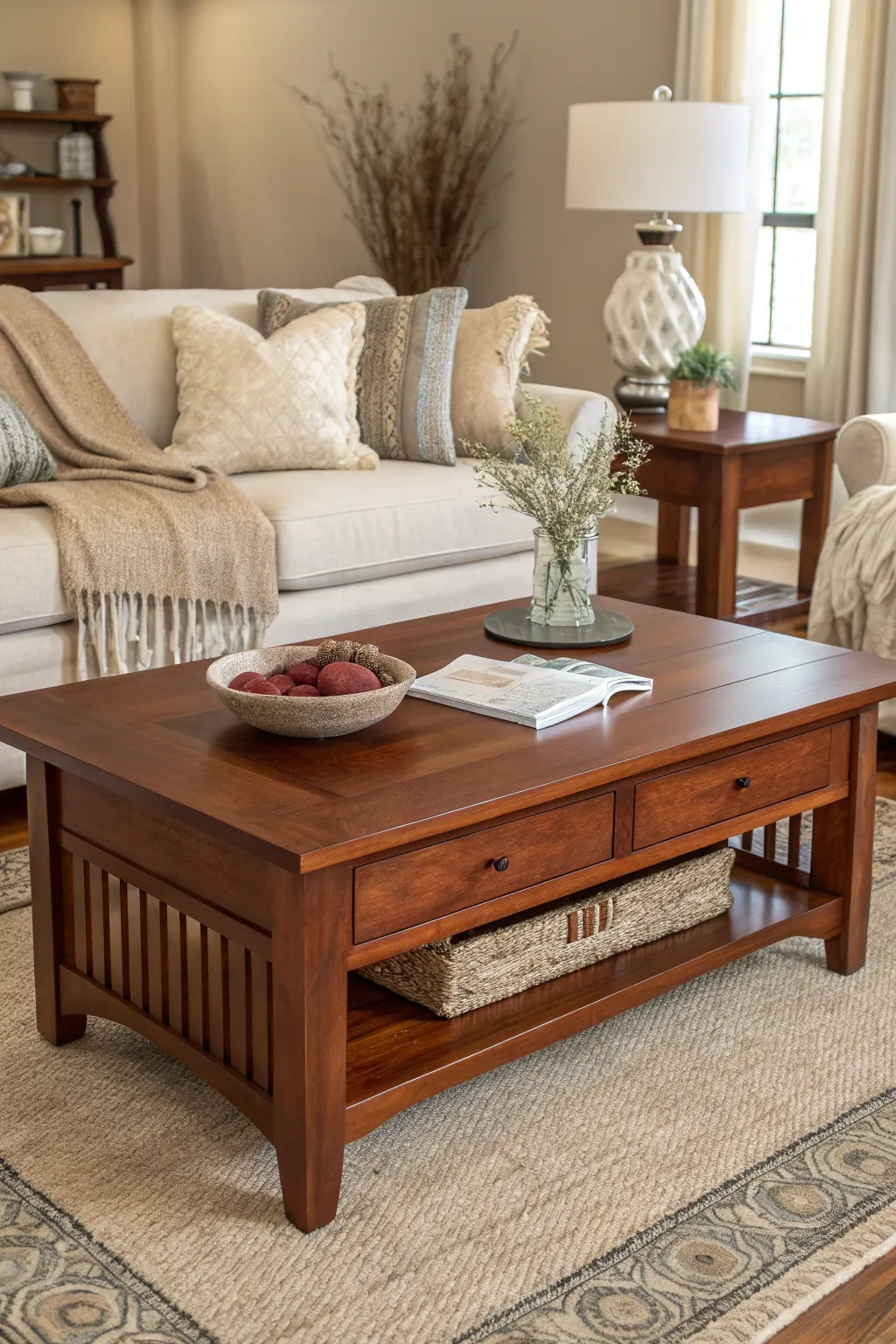 A statement rug under a cherry wood coffee table can define your space and add texture. I love using rugs with intricate patterns or rich colors to complement the deep hues of cherry wood.