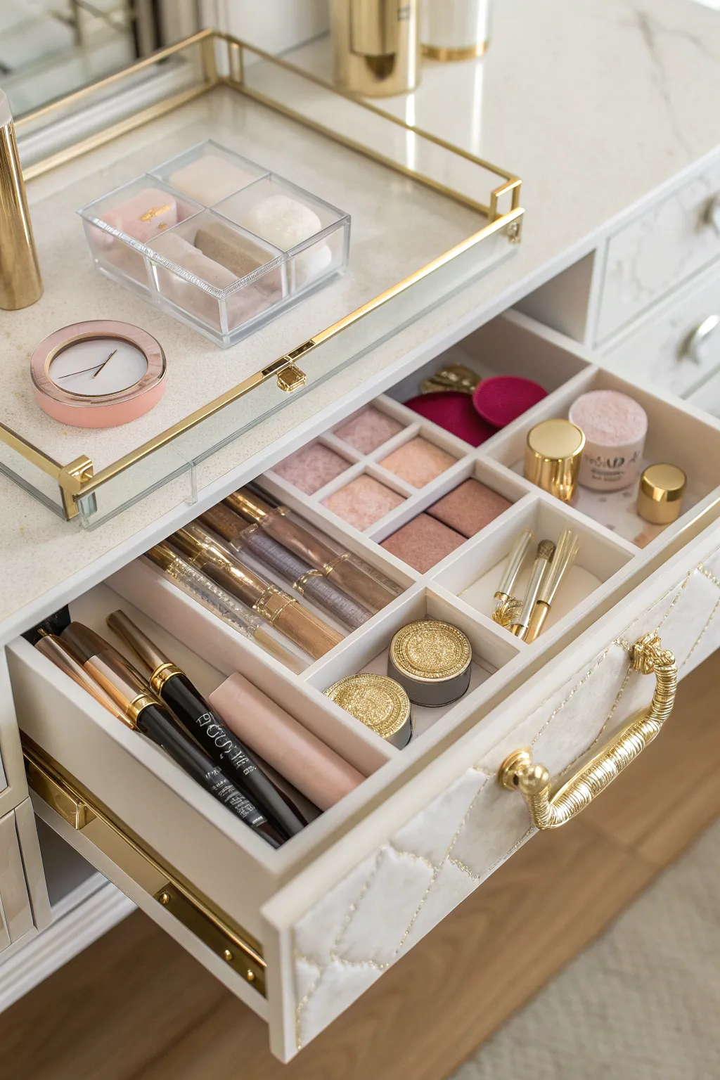 Drawer organizers are a must-have for anyone looking to keep their makeup in check. They help you categorize your products and make it easy to find what you need without the morning scramble.