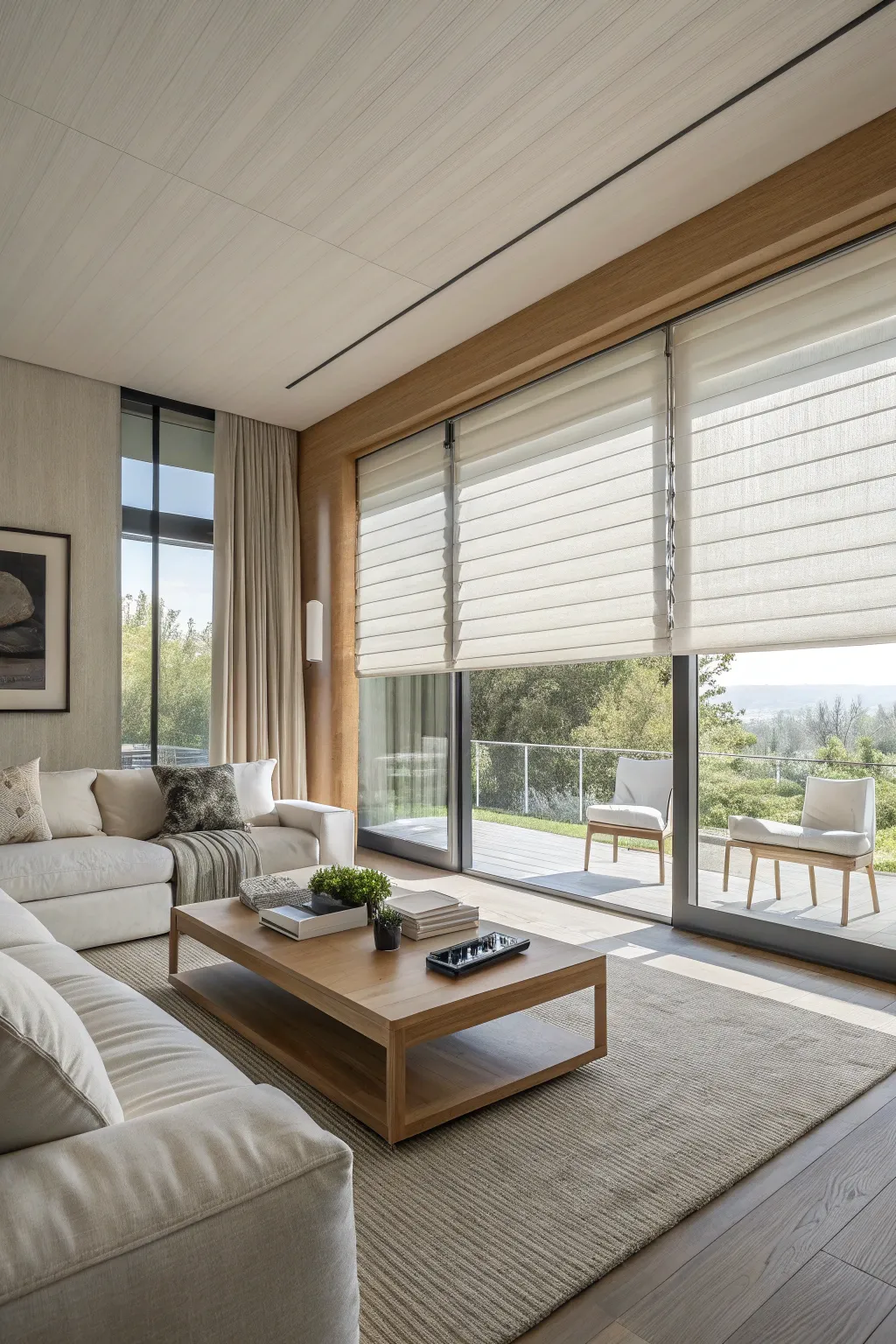 For expansive windows, vertical blinds are a practical and stylish choice. They offer excellent light control and can make your living room feel taller and more spacious.