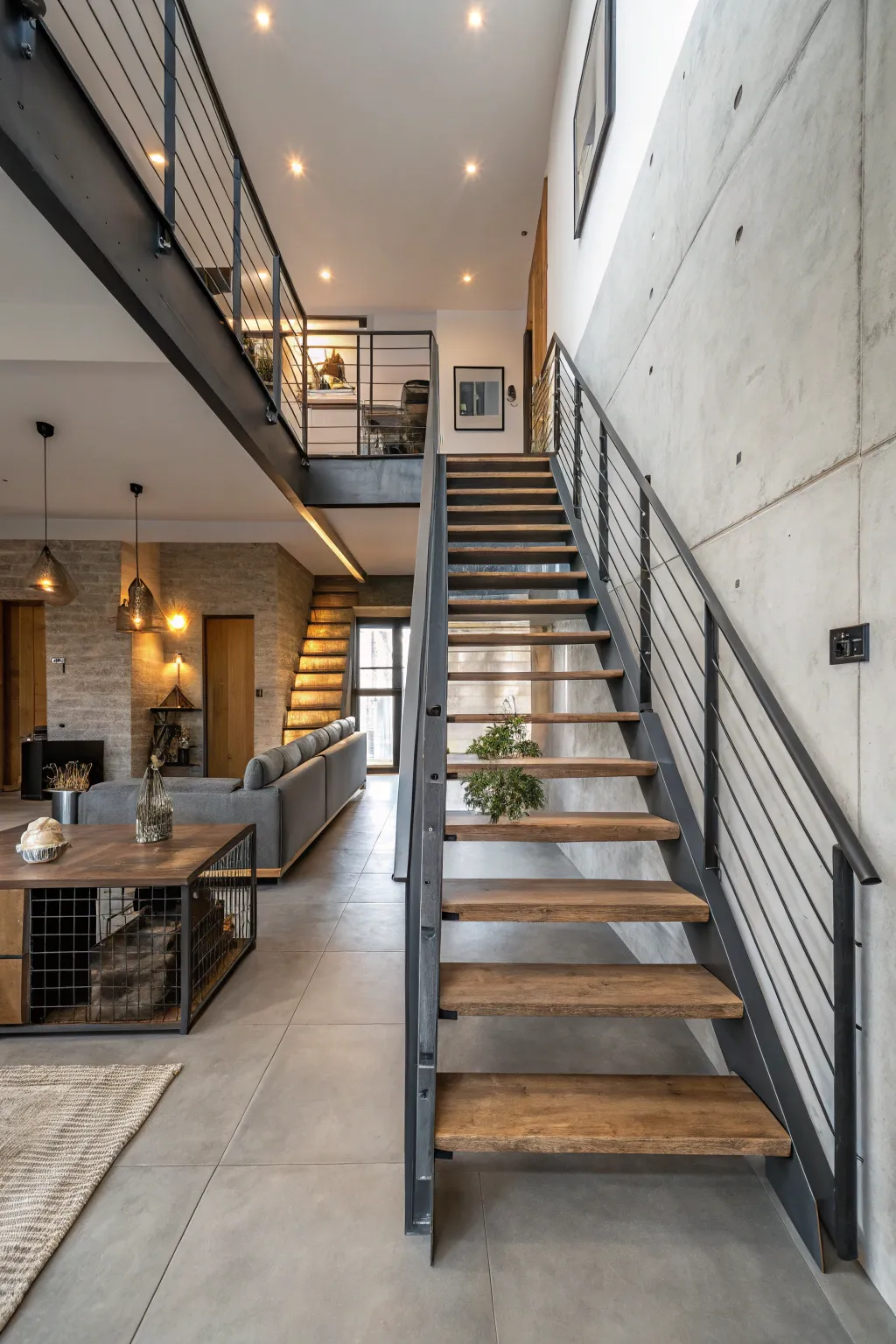 The perfect marriage of warmth and modernity with wood and metal staircases.