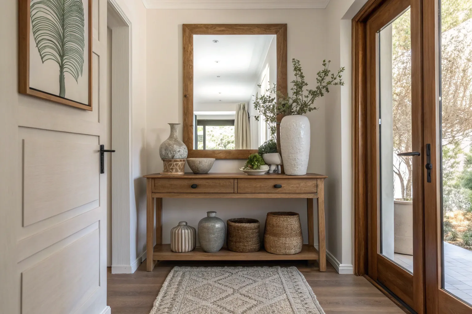 - Large Decorative Wall Mirror: Enhance depth and brightness in your entryway with a large decorative wall mirror.