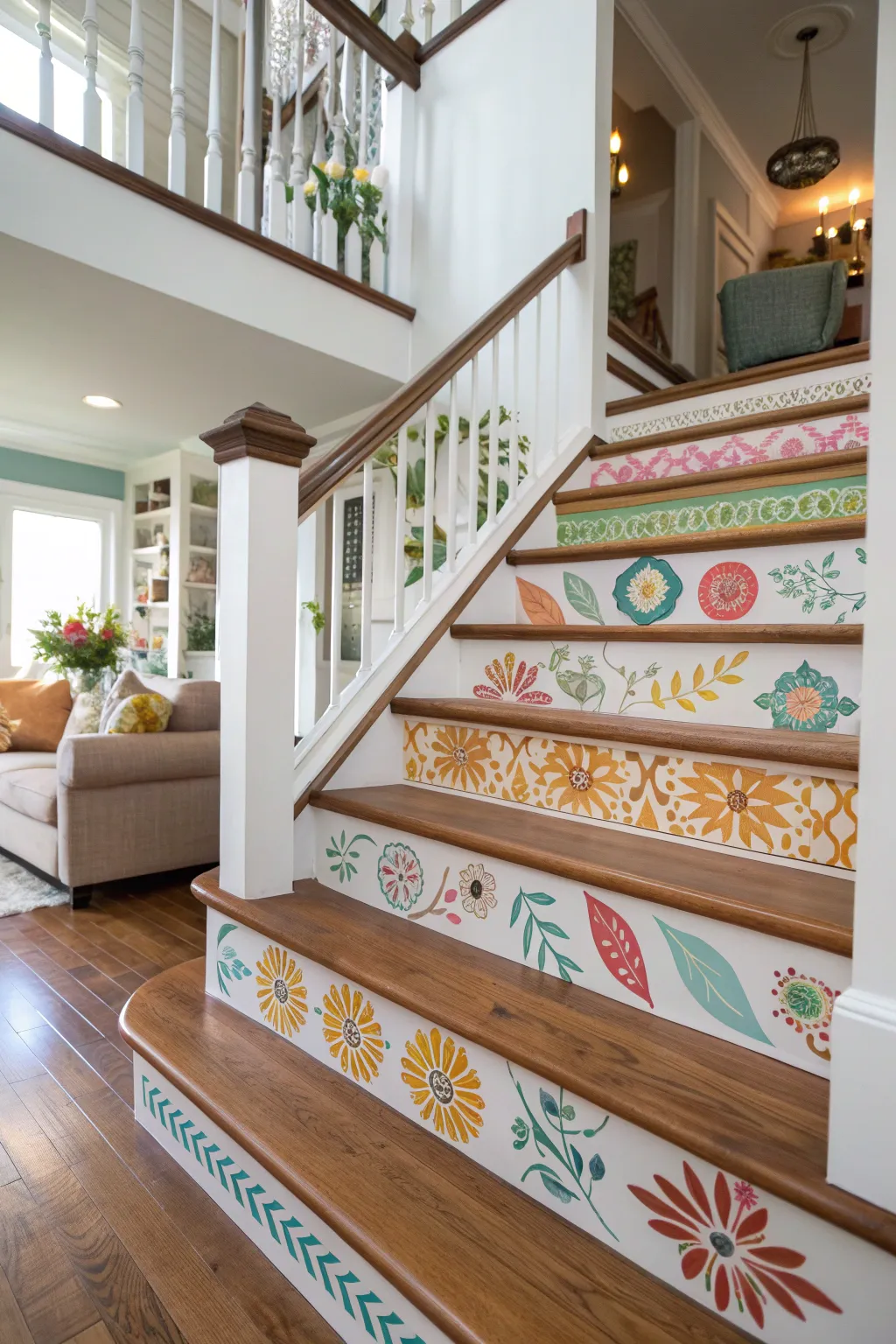 Bring the beauty of nature indoors with floral patterns on your risers. I adore how this design adds a touch of elegance and whimsy, perfect for a spring makeover.