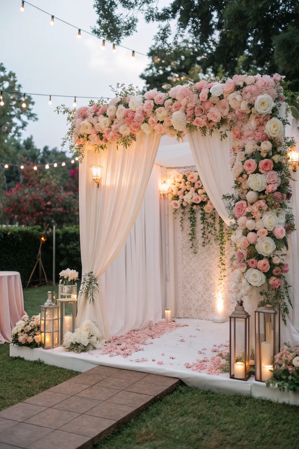 Transform a simple backdrop into a floral wonderland with faux flowers for a lush and dreamy photo booth. I’ve seen this create magical moments at weddings, making guests feel like they’re stepping into a garden of romance.