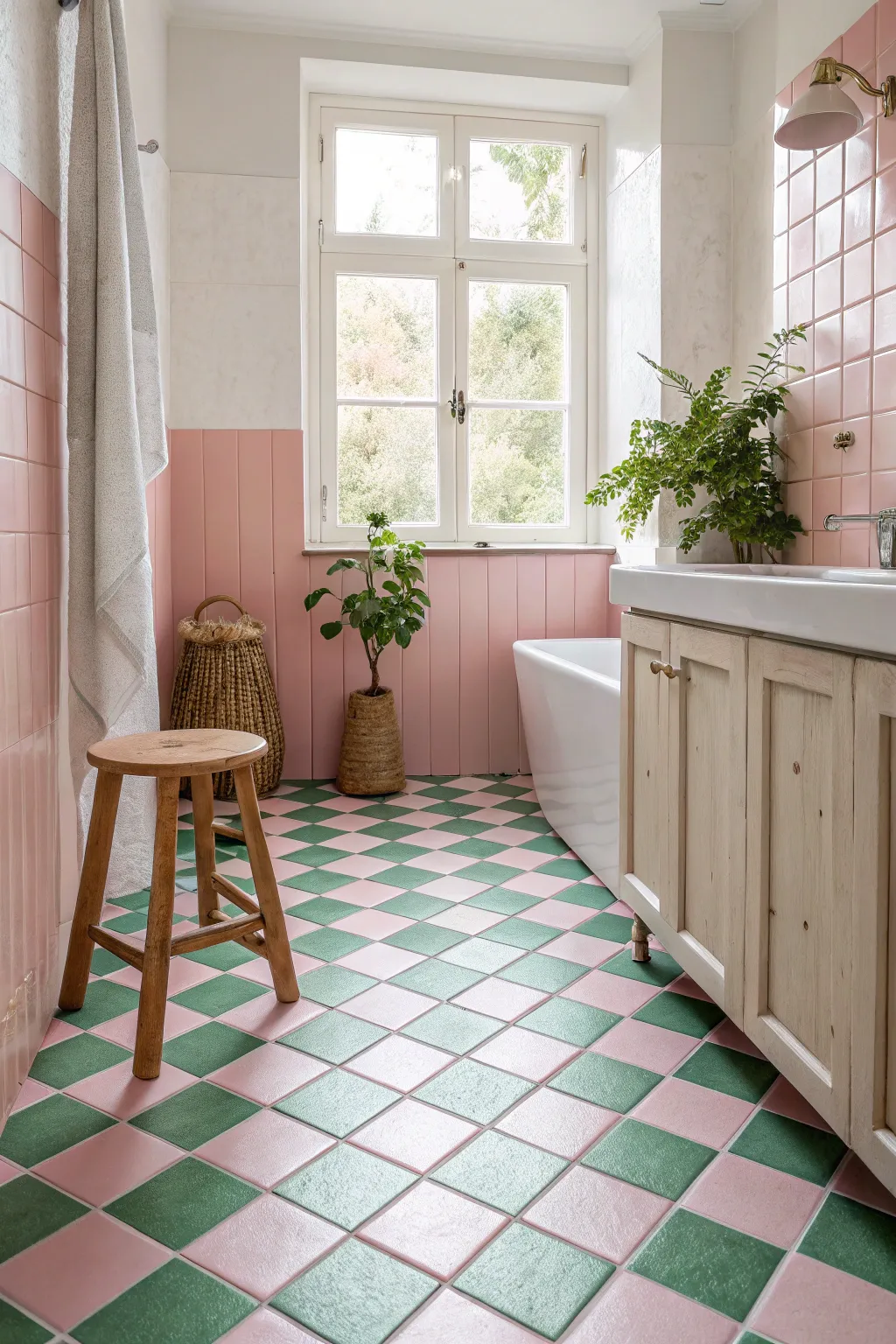 For a classic yet bold look, try checkerboard flooring in alternating pink and green tiles. It’s a timeless choice that always feels fresh.