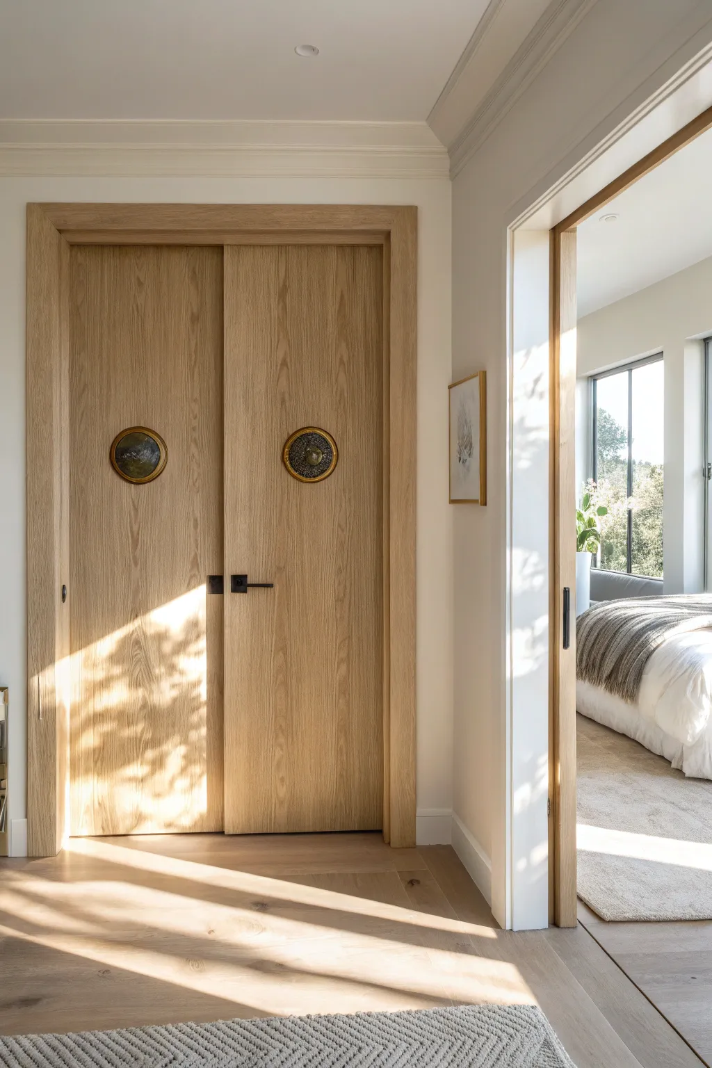 • Matte Black Circular Pocket Door Handles: Upgrade with matte black circular handles for a bold, modern statement.