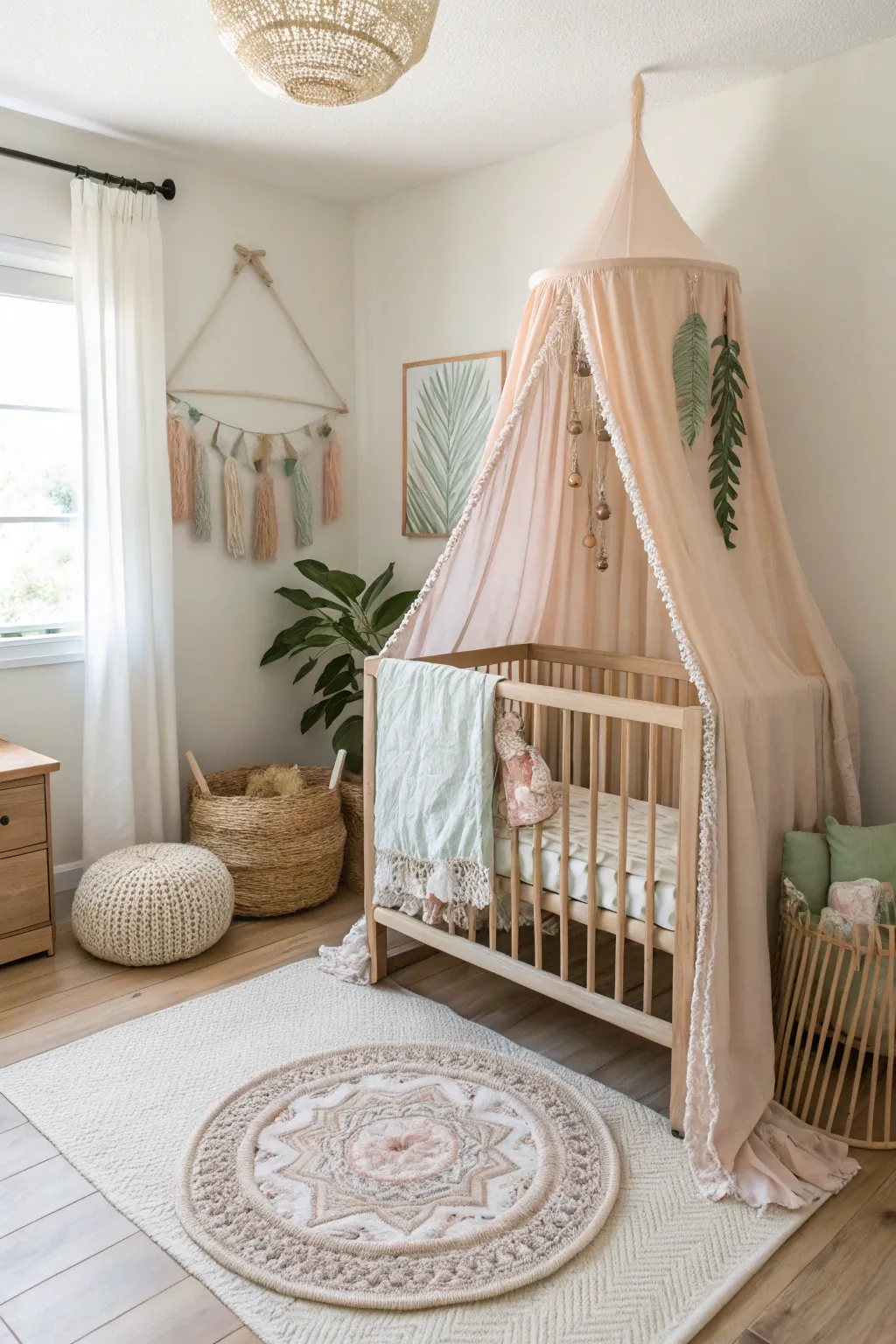 - Woven Nursery Rug: Introduce warmth and style with a woven rug, perfect for the bohemian princess theme.